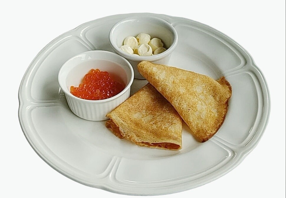 Блинчики бездрожжевые на молоке и сливочном масле, с красной икрой и сливочным маслом