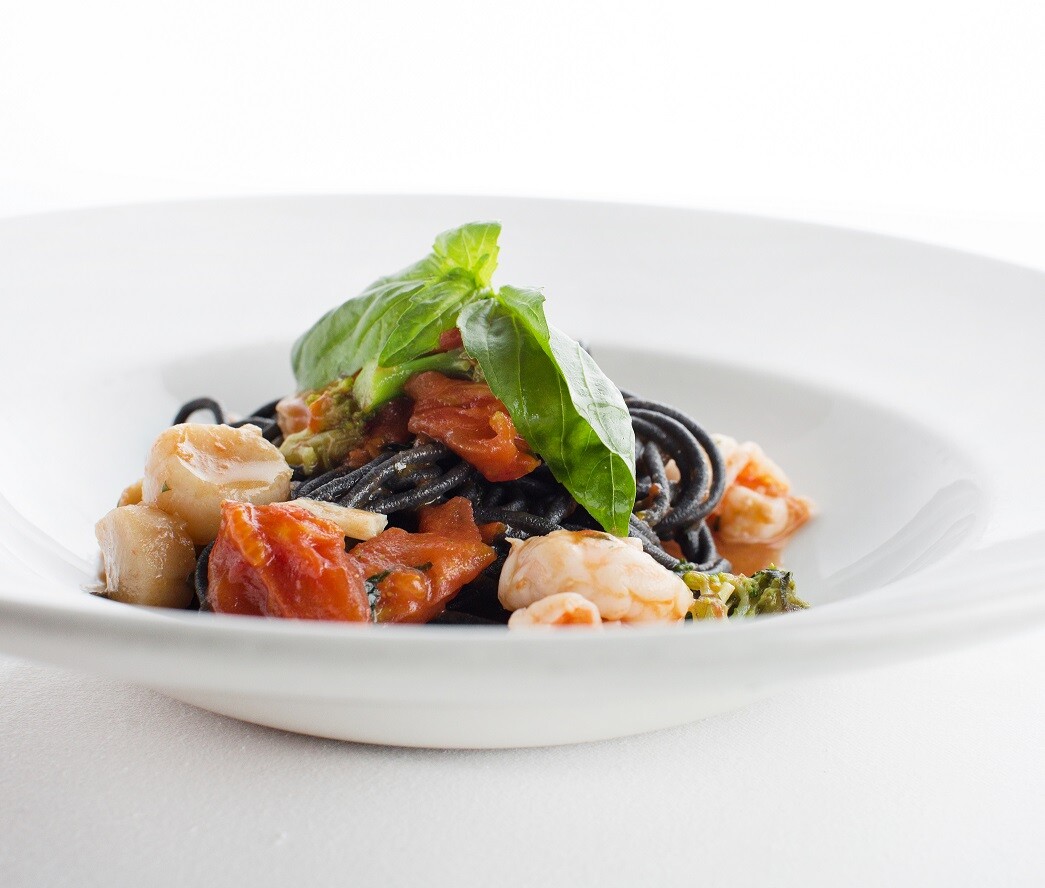 Паста с добавлением чернил каракатиц, с гребешками, мидиями, креветками, брокколи,
