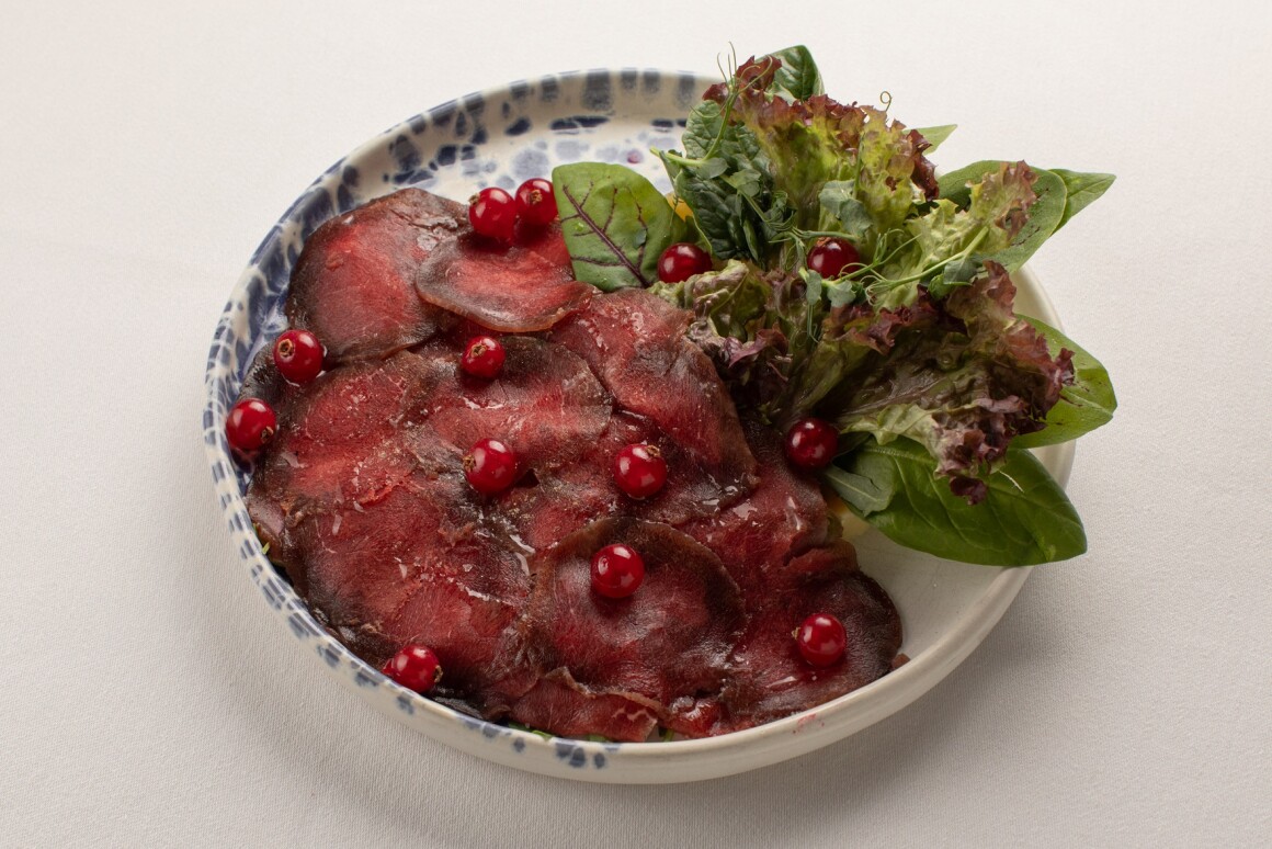 Карпаччо из маринованного мяса лося с мятым картофелем и листьями салатов 130гр - 1180р