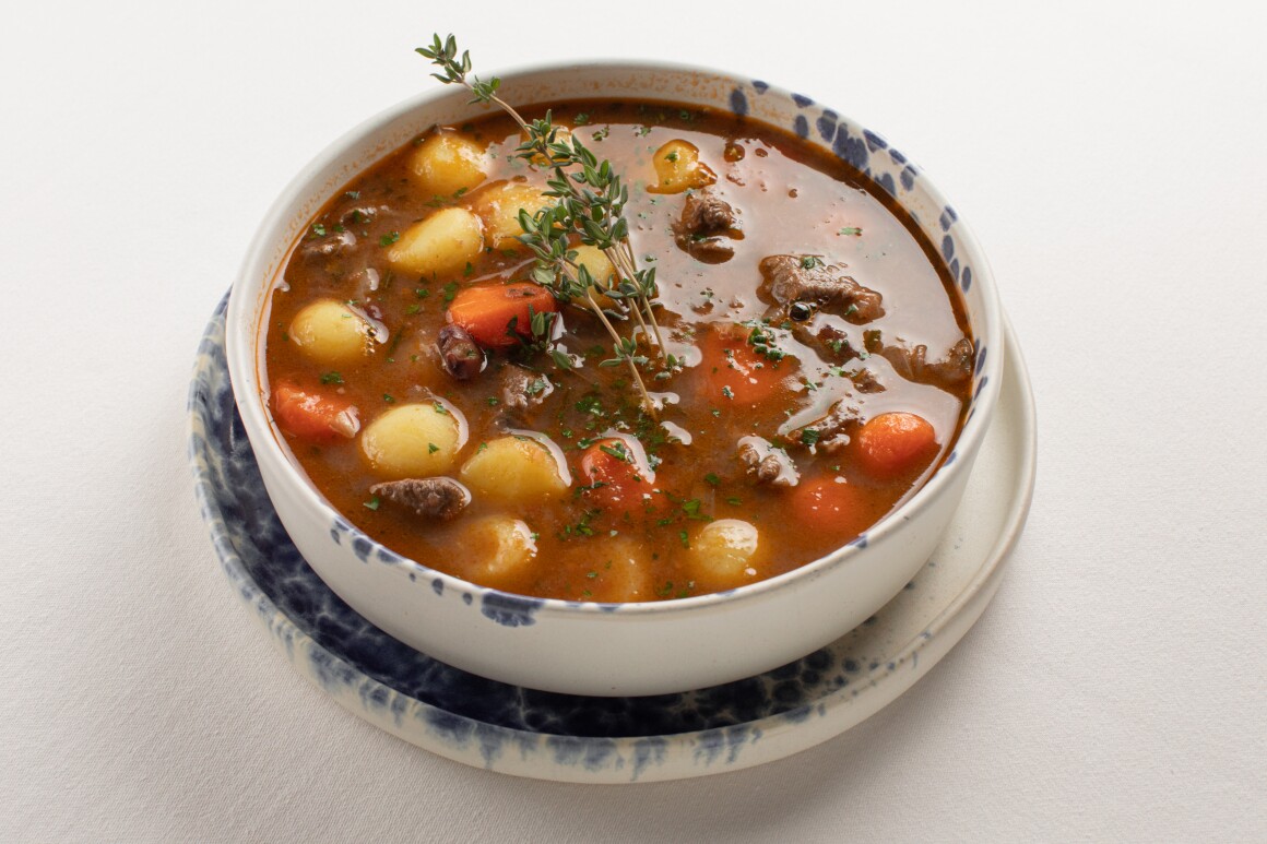 Густой, наваристый суп с картофелем, луком шалот, помидорами, фасолью, морковью, мясомкосули и травами