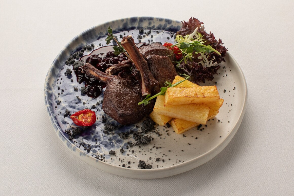 Каре косули обжаренное на гриле, с брусочками запеченного картофеля, листьями лоло россо,кресс-салата, фризе,