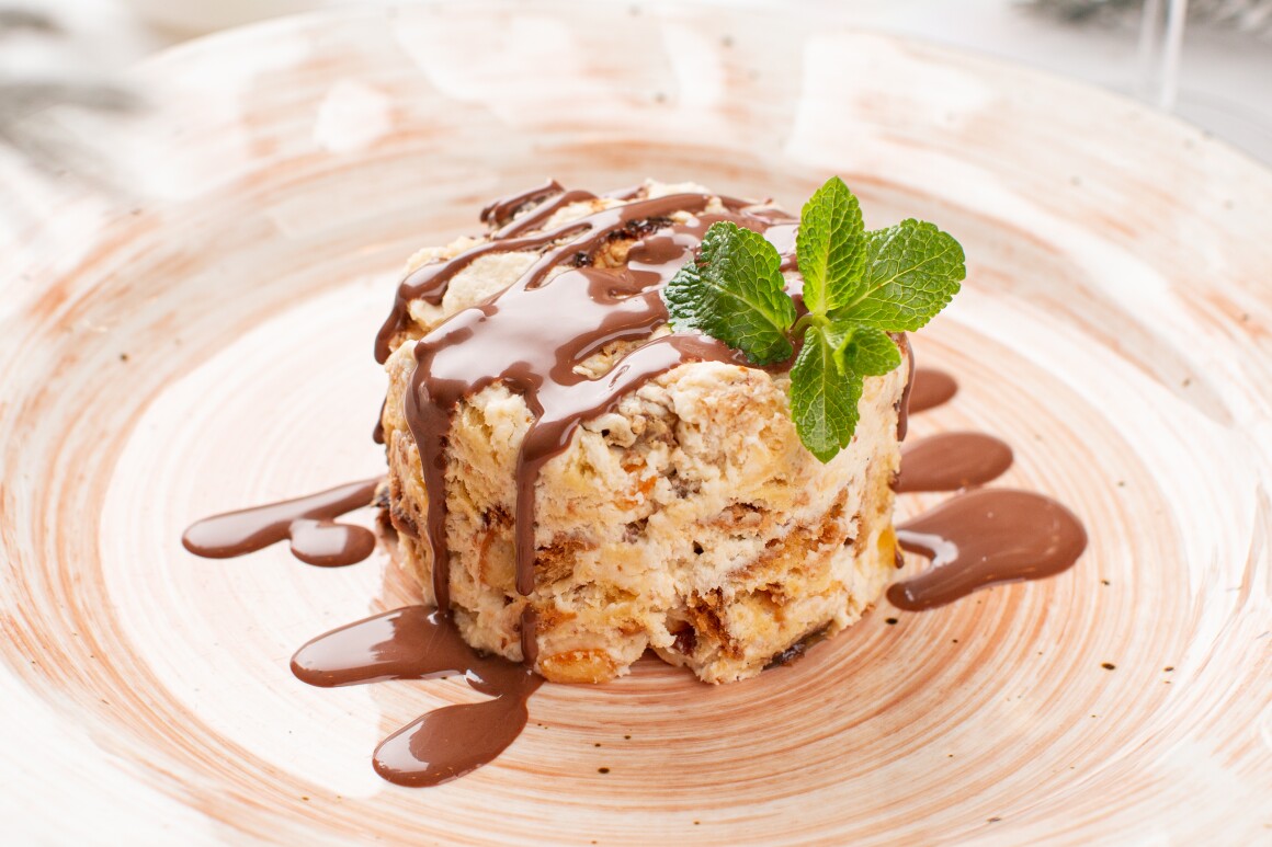 Рождественский торт из мякоти панеттона с маскарпоне, сливками, кремом шантильи, подается сшоколадным соусом