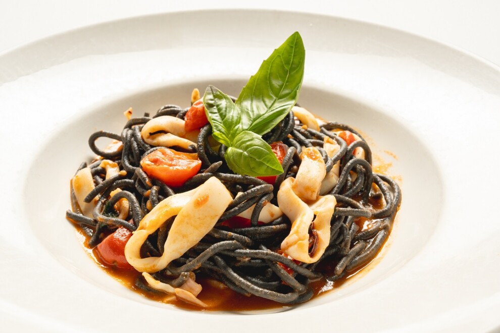 Паста с кальмарами, вином, чесноком, помидорами черри, перцем чили и базиликом