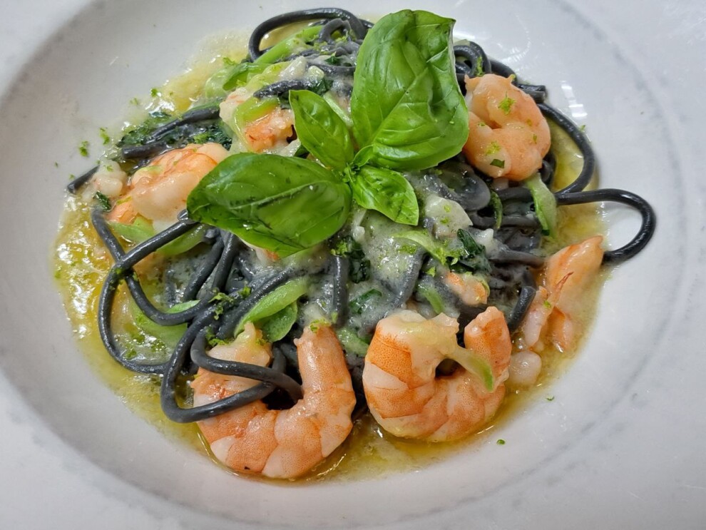 Домашняя паста с креветками, кабачками, чесноком, рыбным бульоном, перцем чили, цедрой лайма и базиликом