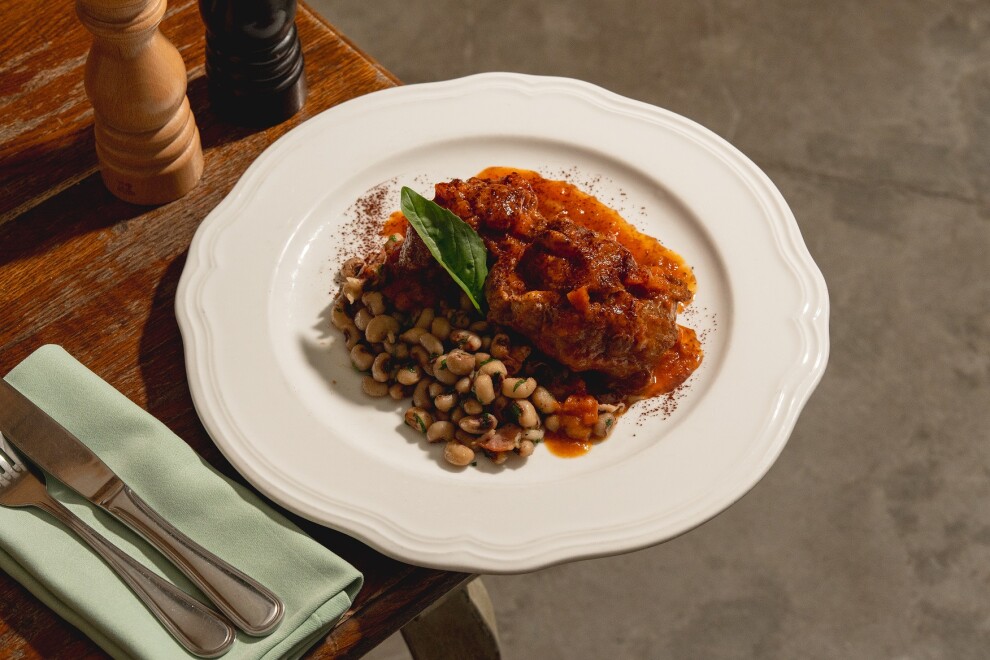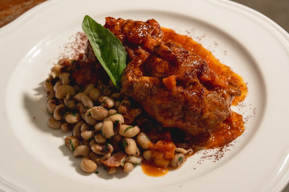 Томленные бычьи хвосты на кости с сельдереем, луком, морковью, чесноком, перцем чили, красным вином и помидорами. Подаются с отварной фасолью с обжаренным беконом, и посыпается порошком какао