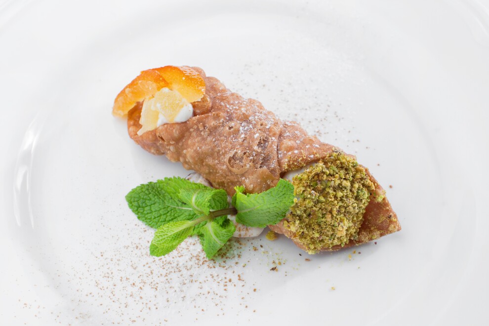 Трубочка канноли с кремом из рикотты, шоколада и сгущенного молока с цукатами, с фисташками дроблеными, корицей и мятой