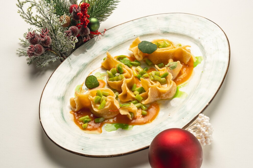 Домашняя паста в виде конфет, с начинкой из форели с луком шалот, соусом бешамель и цедрой апельсина. Подается со спаржей, сливочным маслом и с соусом из биска, лука шалот и перца чили