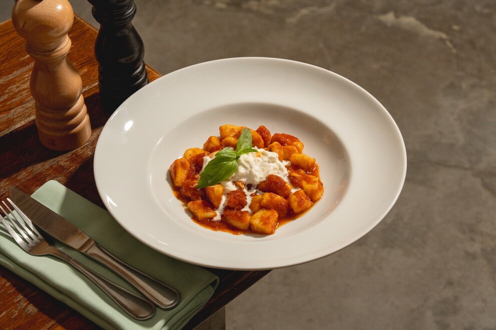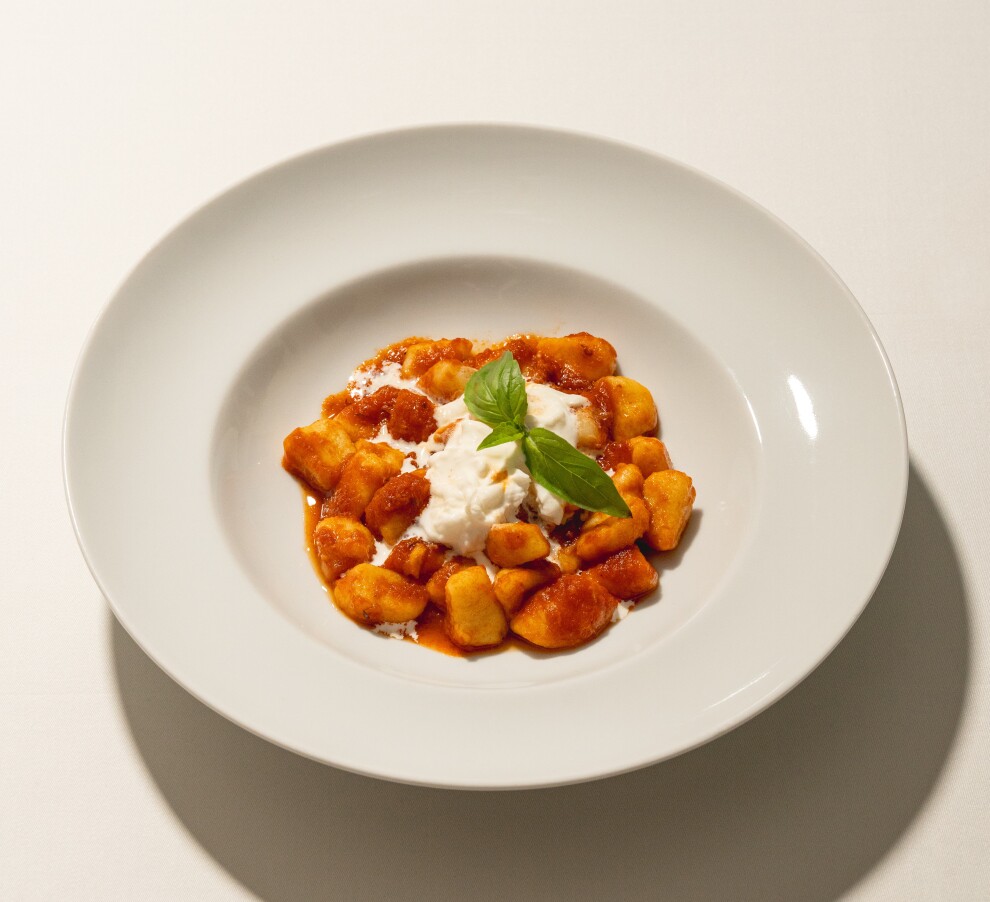 Домашняя паста из картофеля и муки, с томатным соусом, чесноком, сливочным маслом и травами. Подается со страчателлой