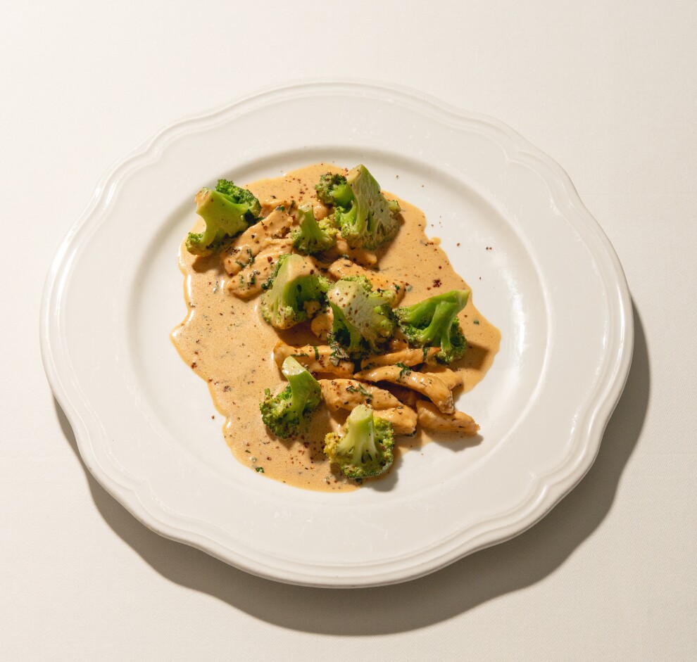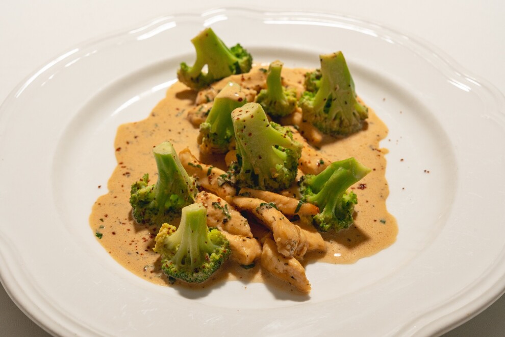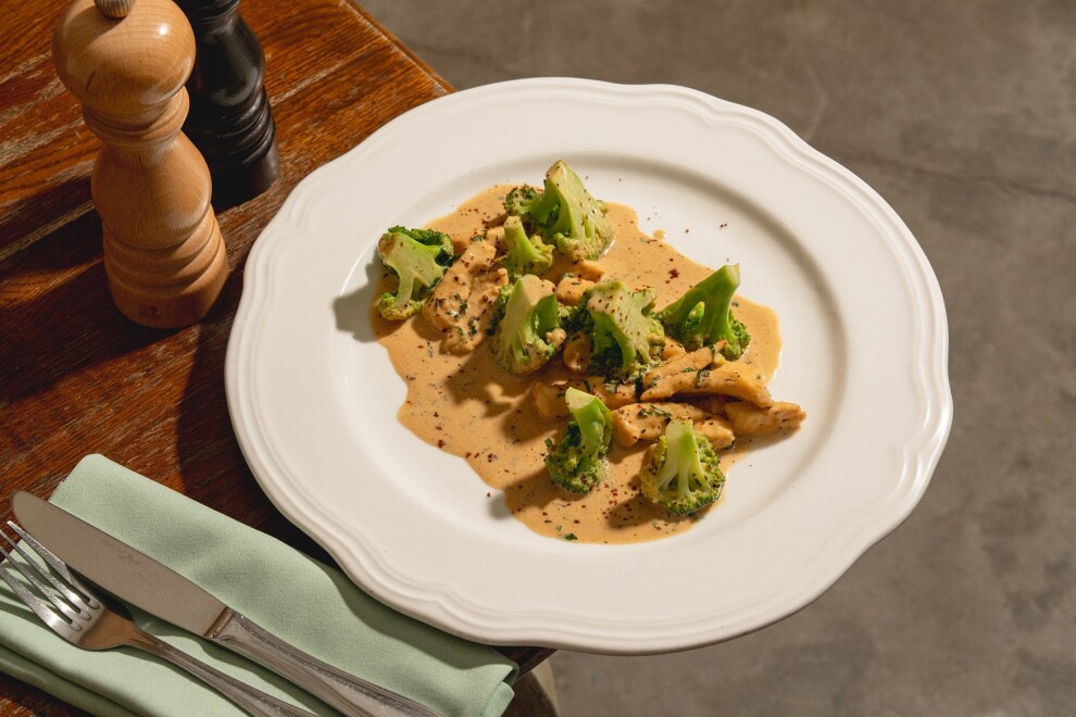 Ломтики куриного филе с чесноком, вином, перцем чили, зеленью, травами, соусом демиглас, сливками и цветной капустой