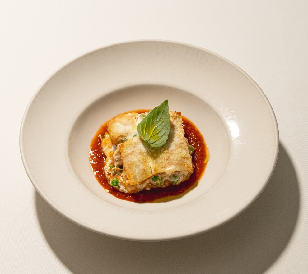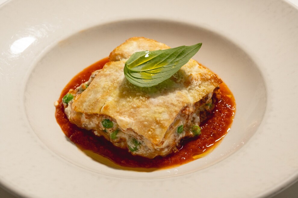 Домашняя паста, запеченный слоеный пирог, из тонкого теста с начинкой из пармской ветчины и лука, моцареллы, зеленого горошка, томатного соуса и соуса бешамель