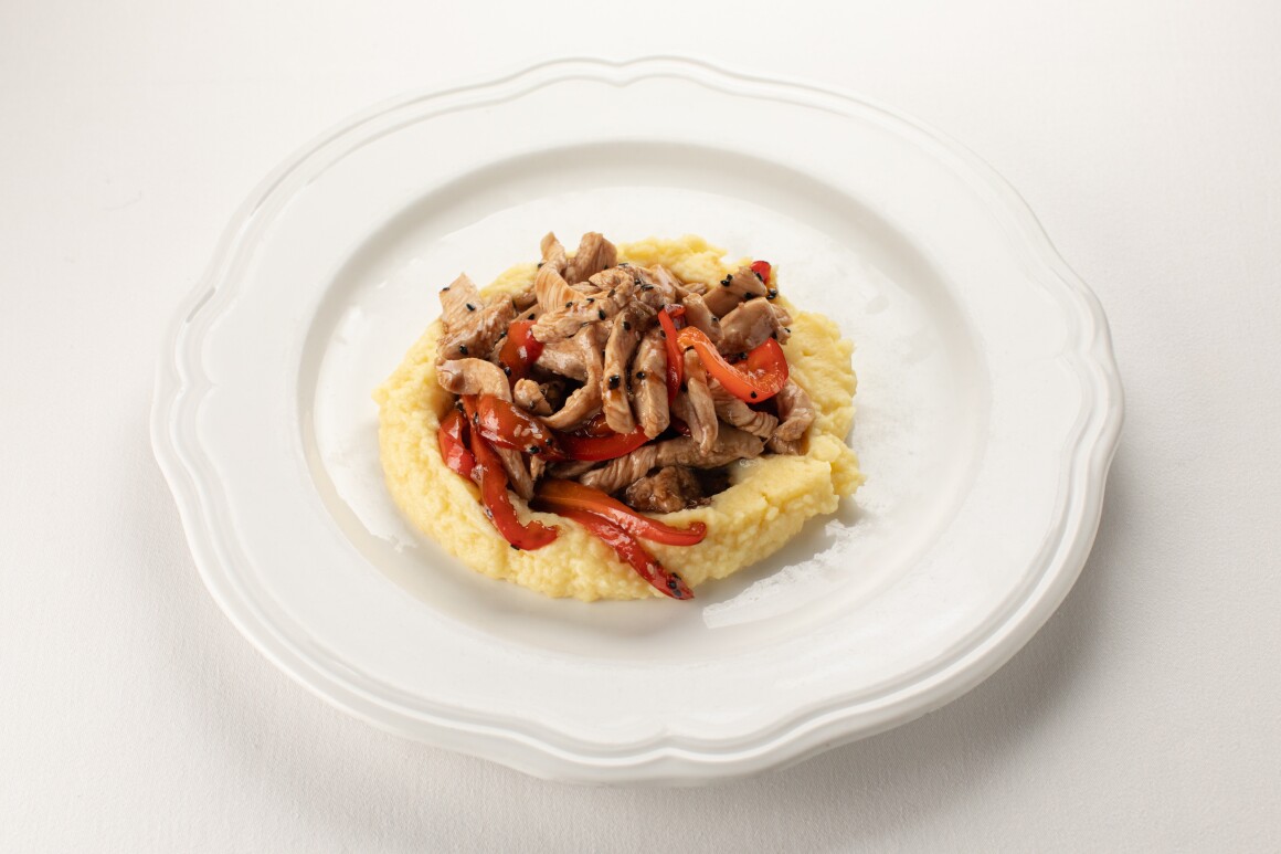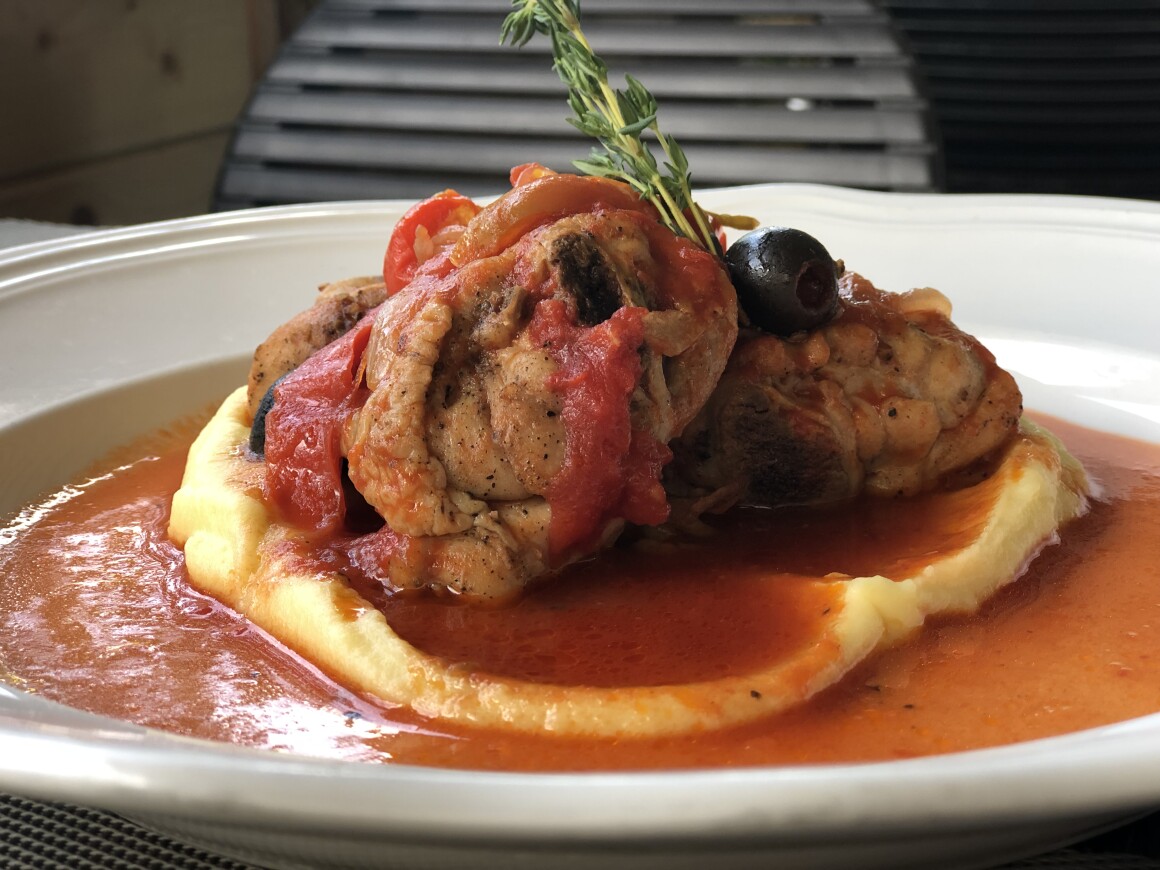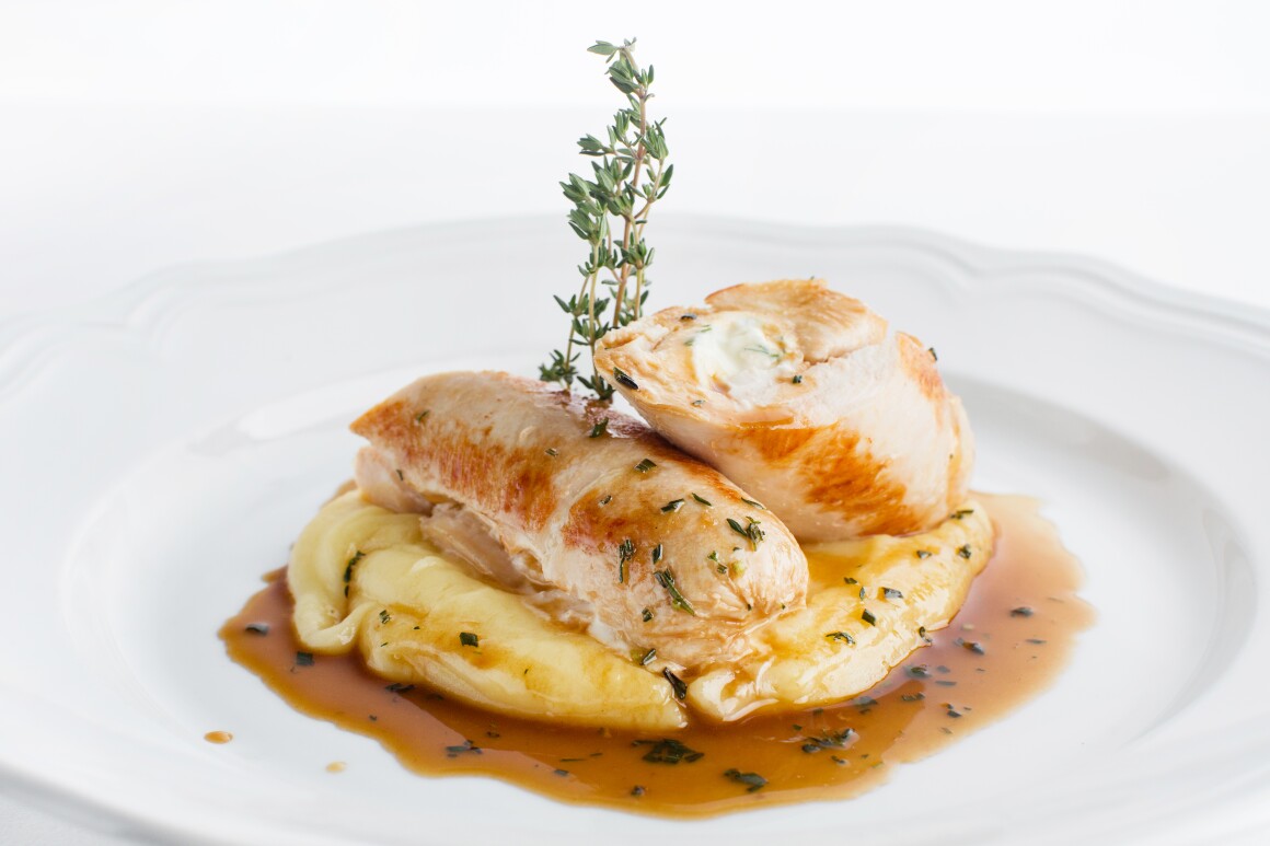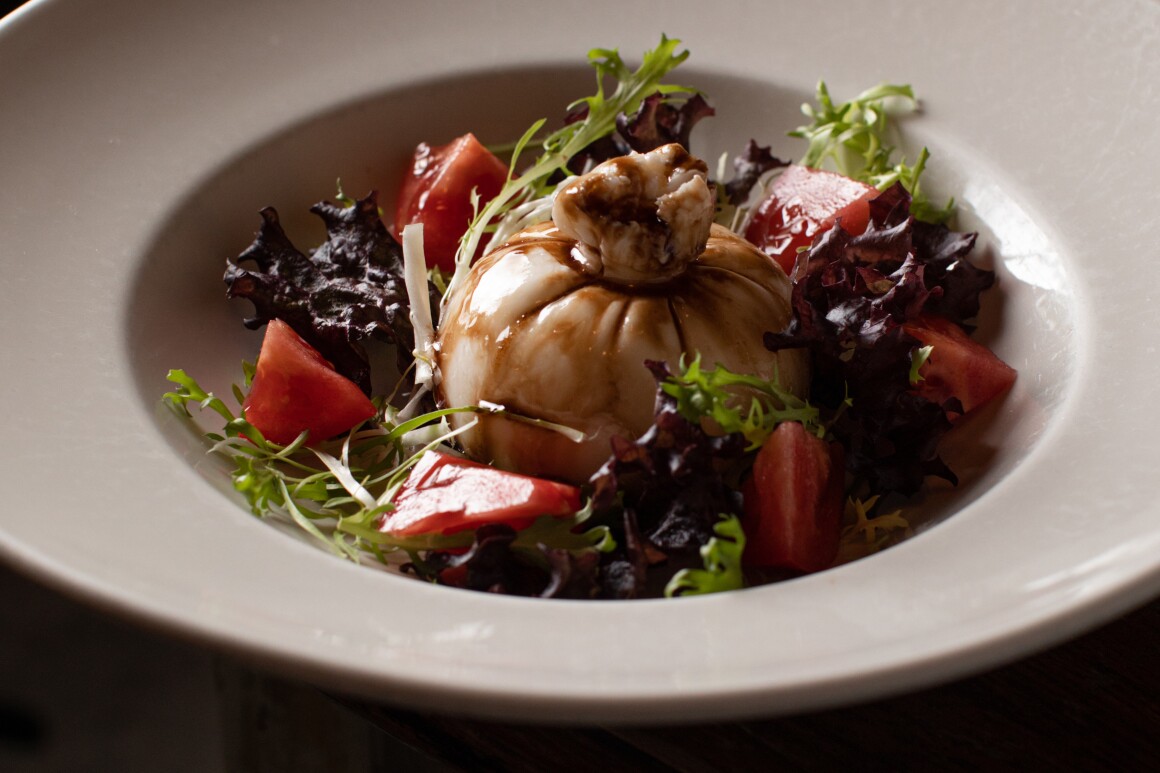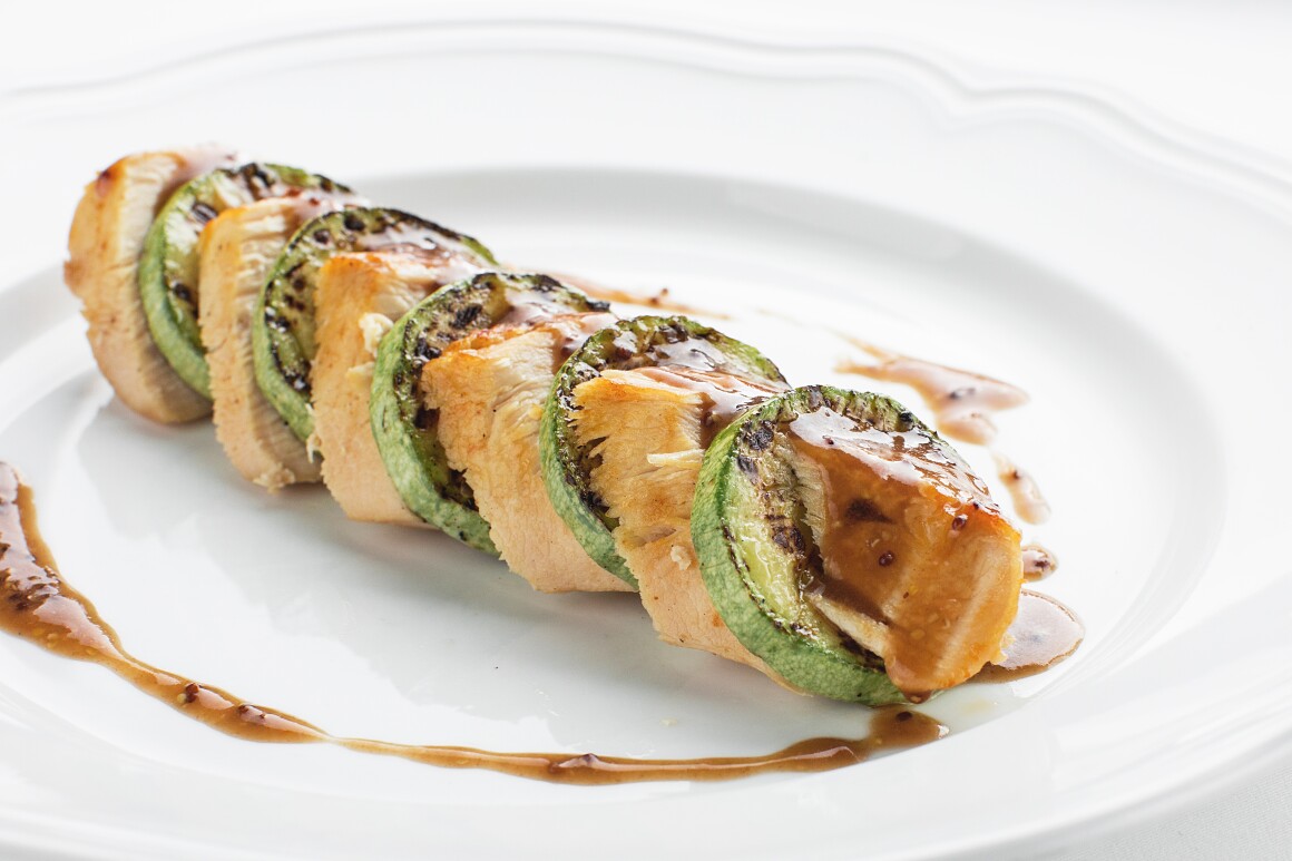 - Запеченный рулет из свиной шейки с начинкой из свиного фарша с добавлением вина и специй, и с сыром скаморца. Подается с припущенным шпинатом, обжаренными шампиньонами, помидорами черри, соусом сезам из соевого соуса, вина, имбиря и с крошкой из маслин