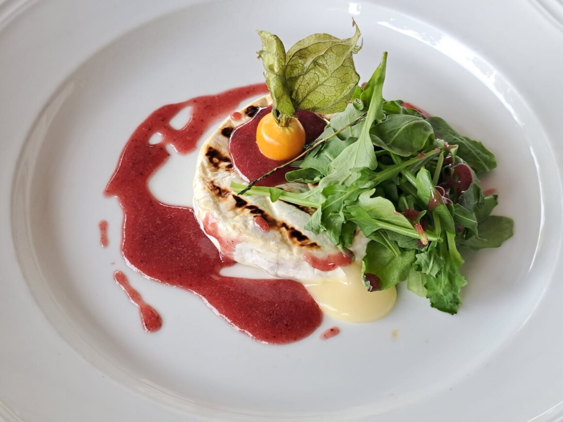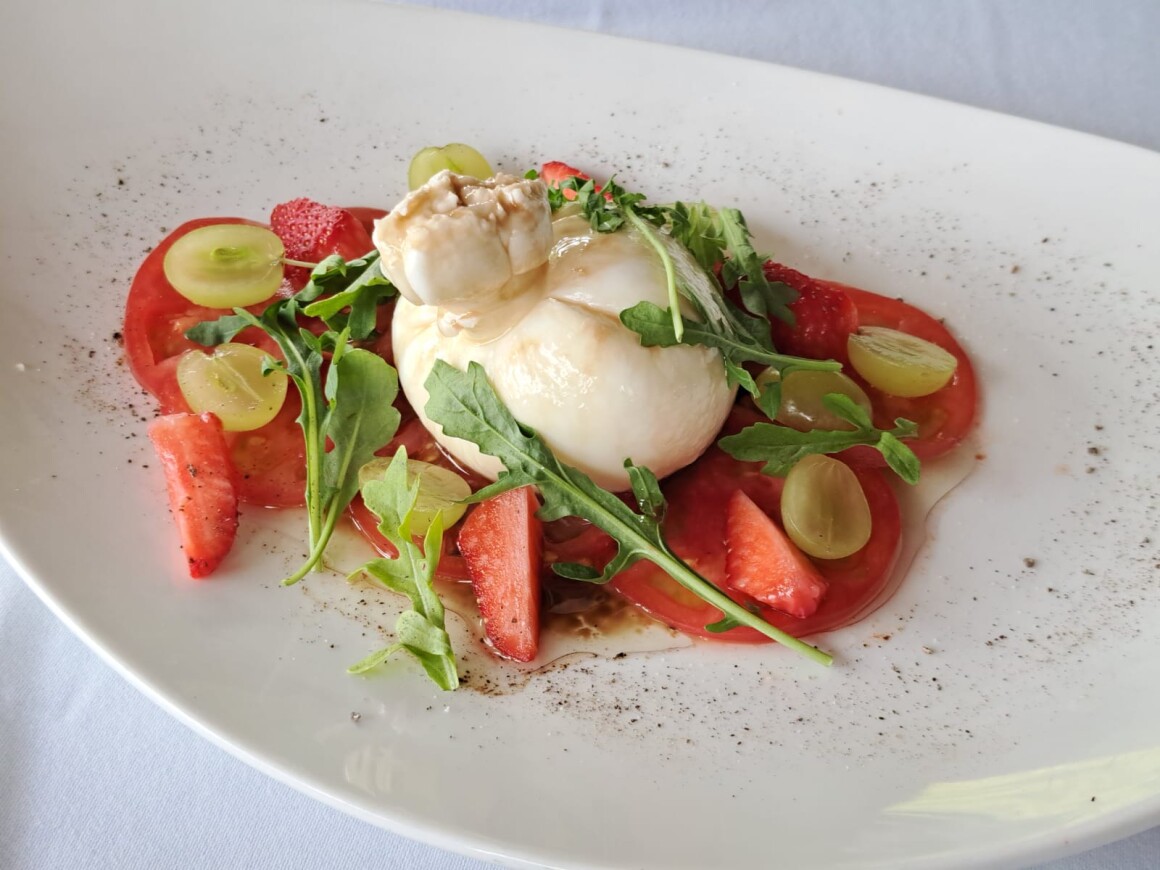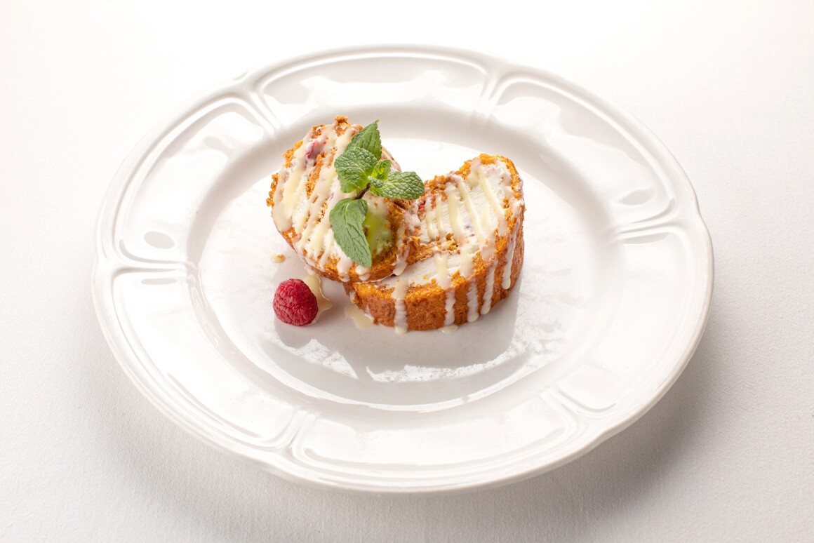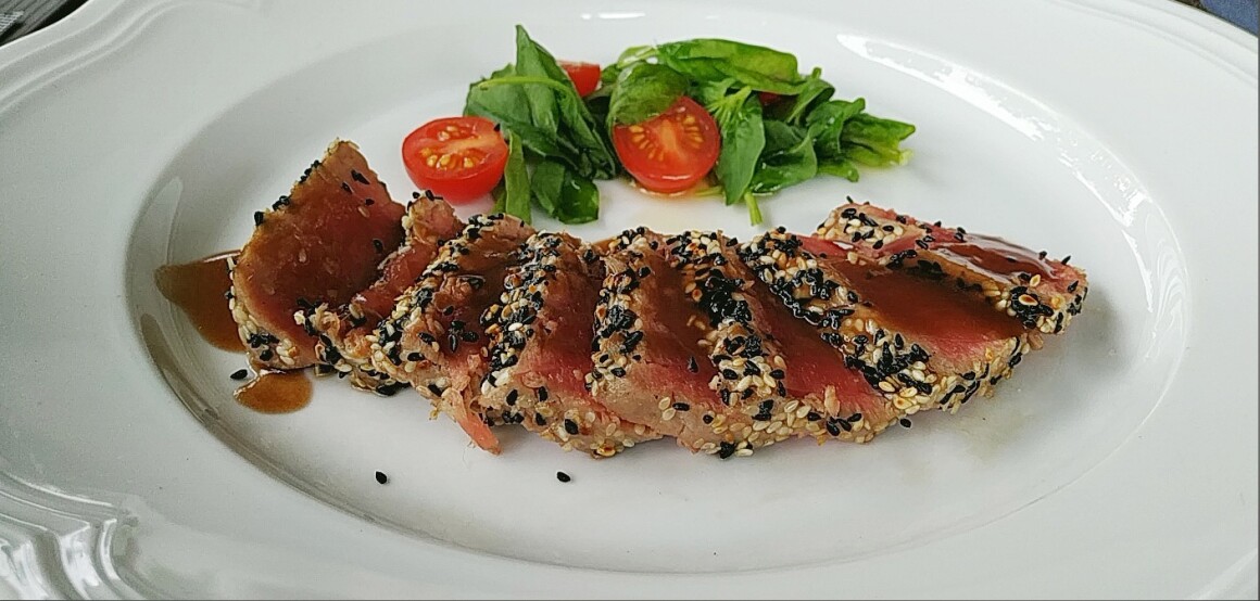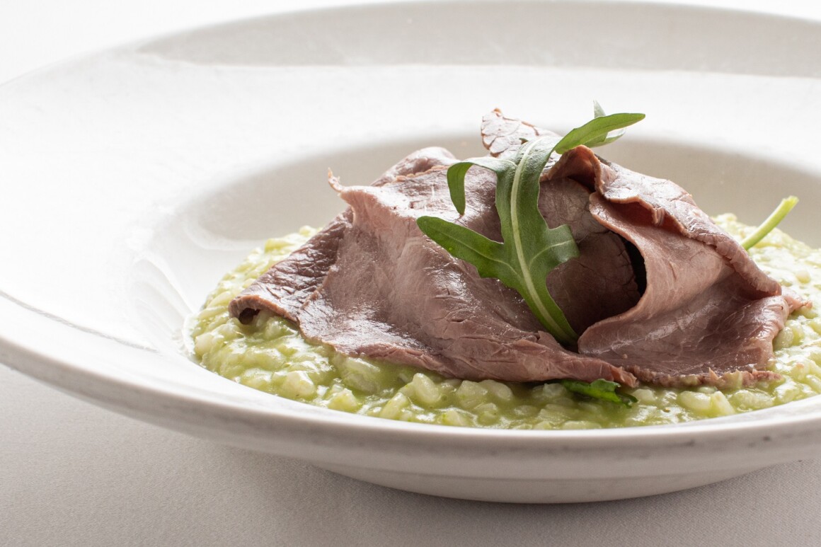 - Запеченный рулет из свиной шейки с начинкой из свиного фарша с добавлением вина и специй, и с сыром скаморца. Подается с припущенным шпинатом, обжаренными шампиньонами, помидорами черри, соусом сезам из соевого соуса, вина, имбиря и с крошкой из маслин