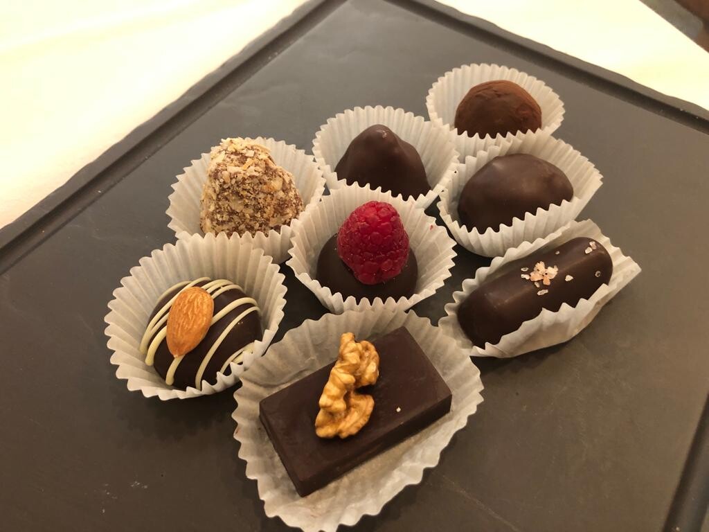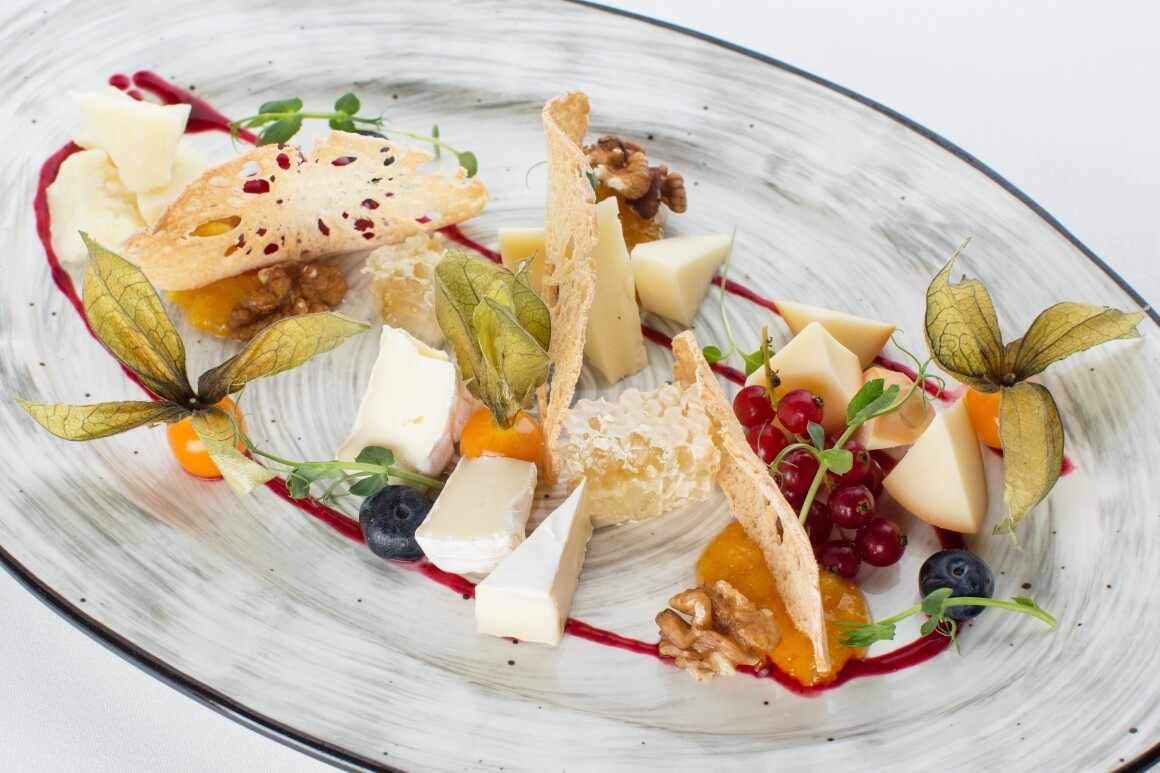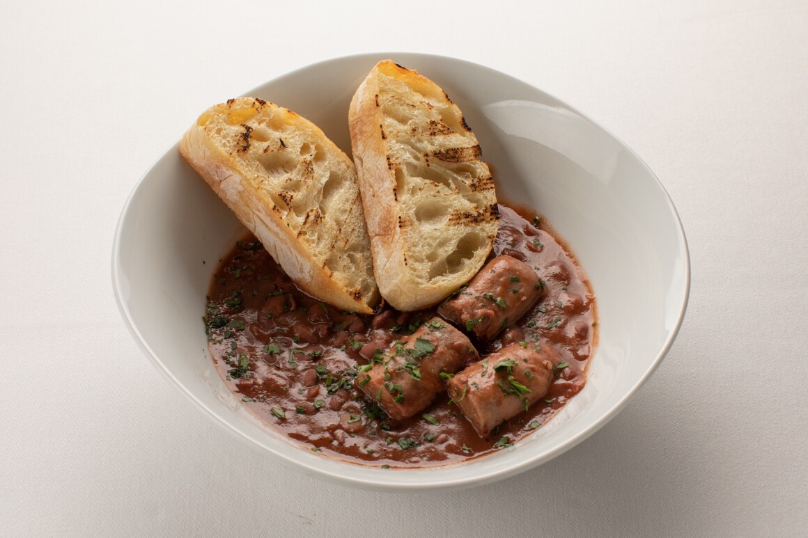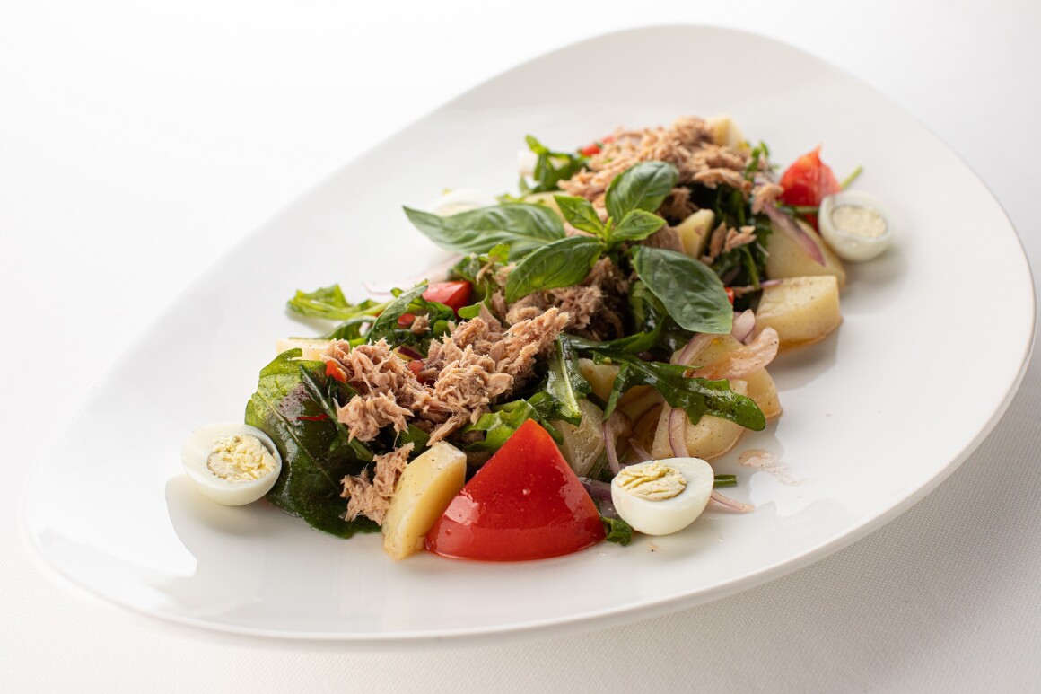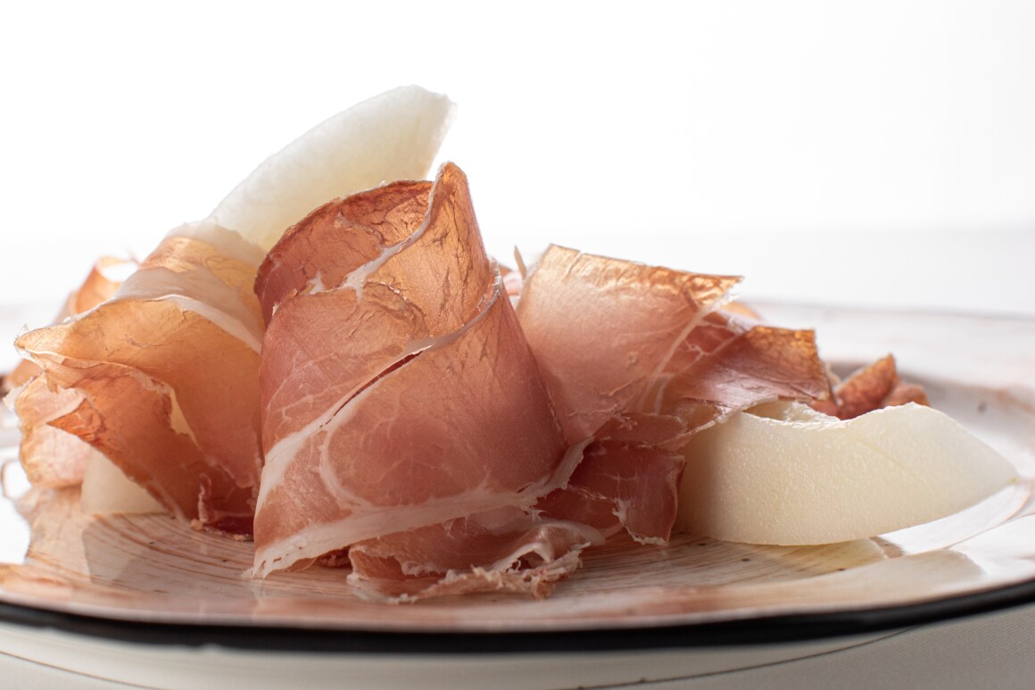 - Запеченный рулет из свиной шейки с начинкой из свиного фарша с добавлением вина и специй, и с сыром скаморца. Подается с припущенным шпинатом, обжаренными шампиньонами, помидорами черри, соусом сезам из соевого соуса, вина, имбиря и с крошкой из маслин