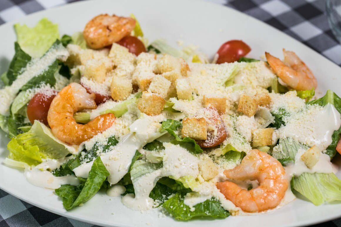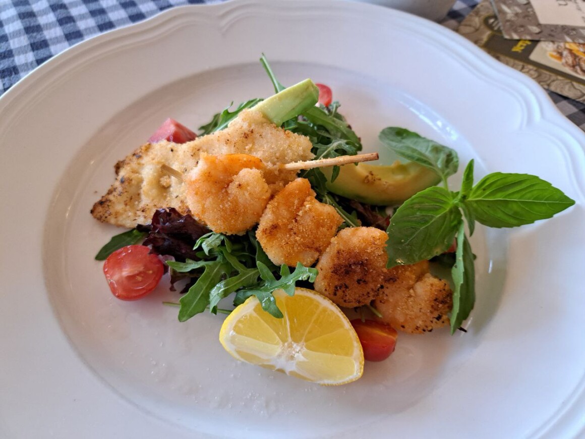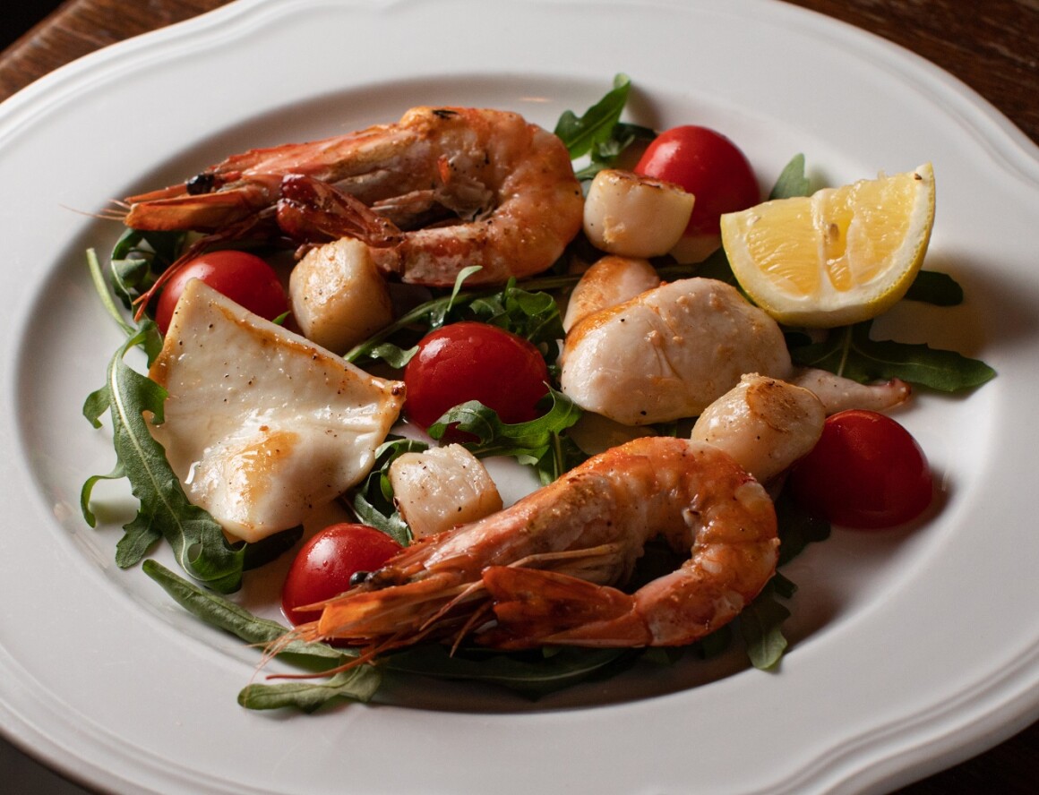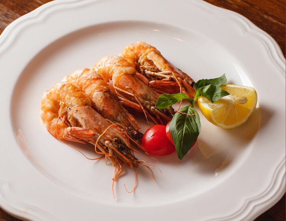 - Тигровые креветки на гриле, с кабачками на гриле и соусом сальса из помидоров, каперсов, лука шалот и оливкового масла)