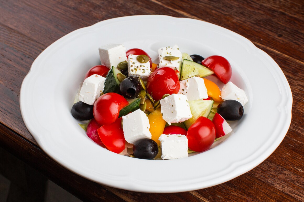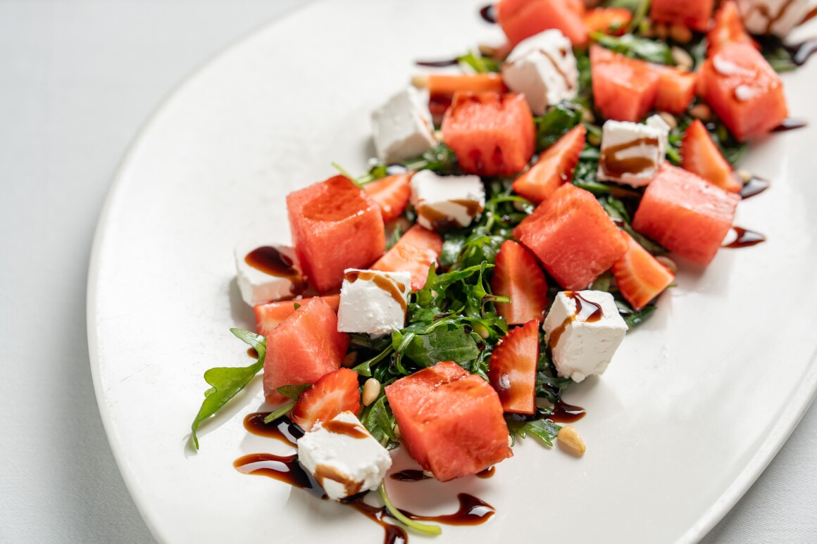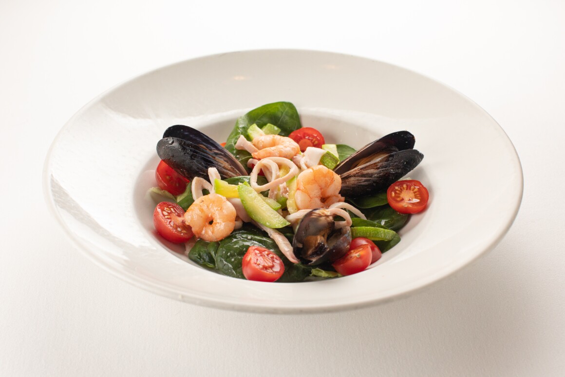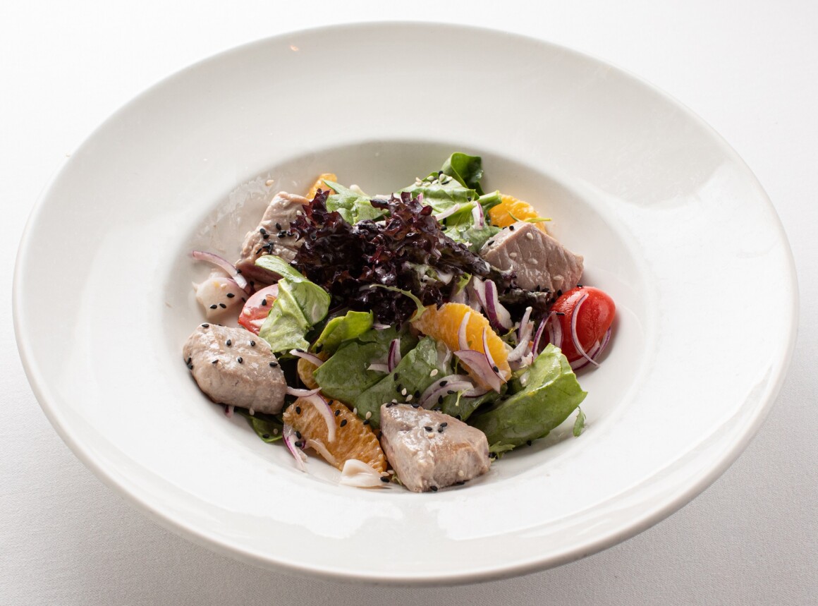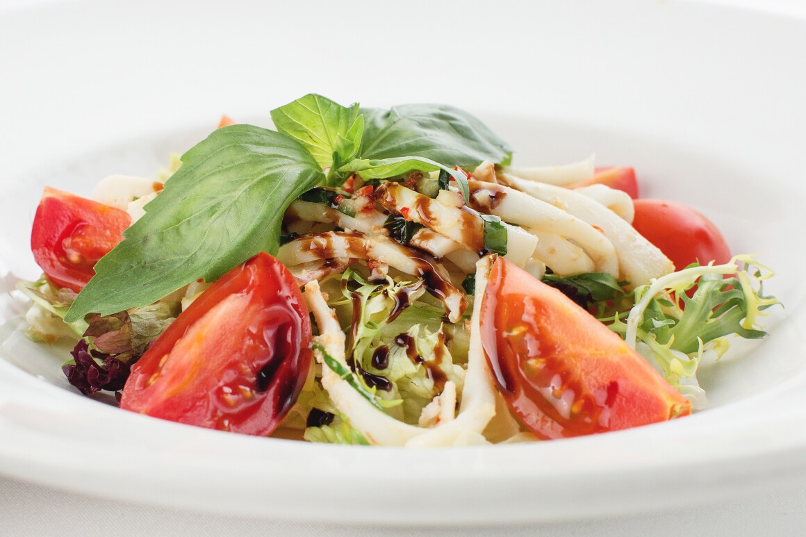 - Листья рукколы с обжаренными кальмарами, красным маринованным луком, помидорами черри, сыром фета и апельсиново-горчичным соусом с добавлением меда и оливкового масла