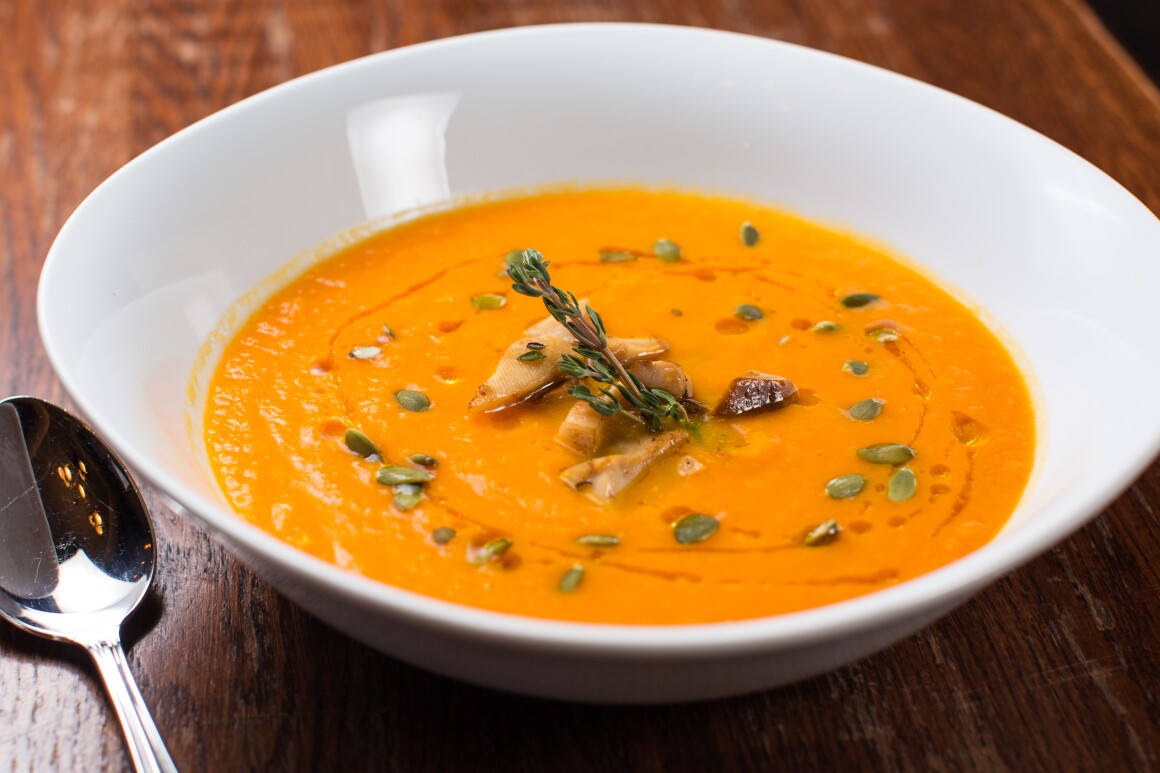 - Домашняя паста из гречневой муки с сальсичче из свинины со специями и вином, с луком, кремом из тыквы, шампиньонами, петрушкой, пармезаном и базиликом