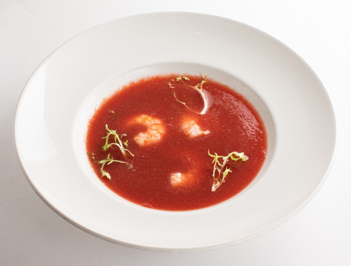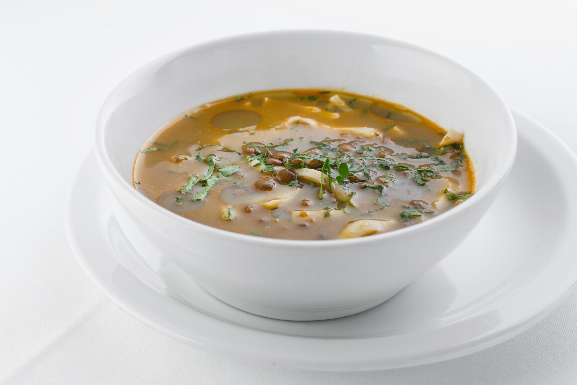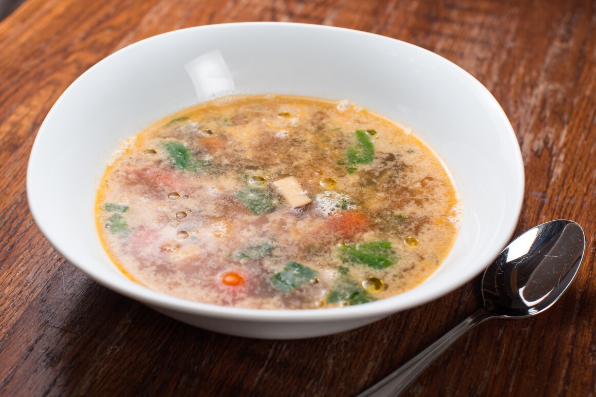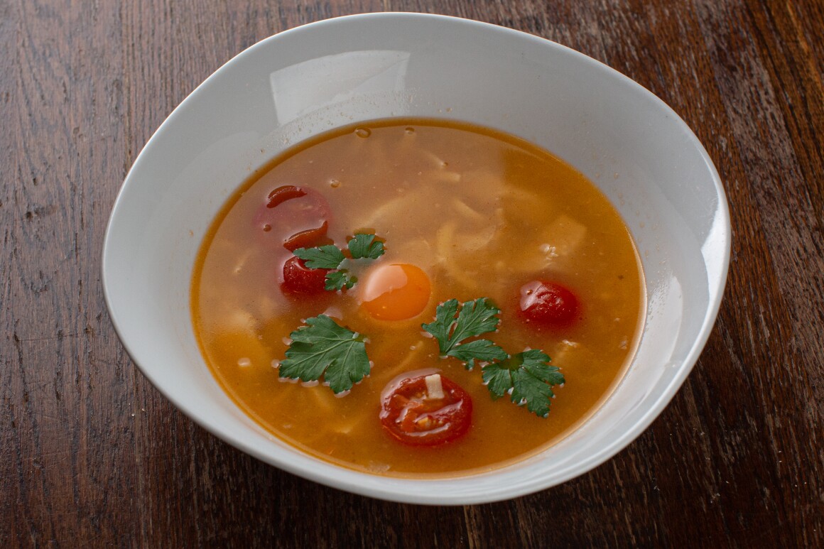 - Говяжий бульон с говядиной, куриным филе и говяжьим языком, с картофелем, болгарским перцем, луком, морковью, сельдереем и базиликом