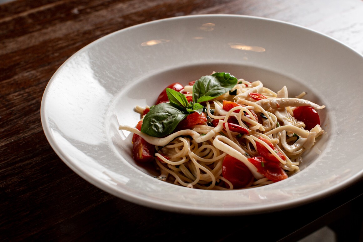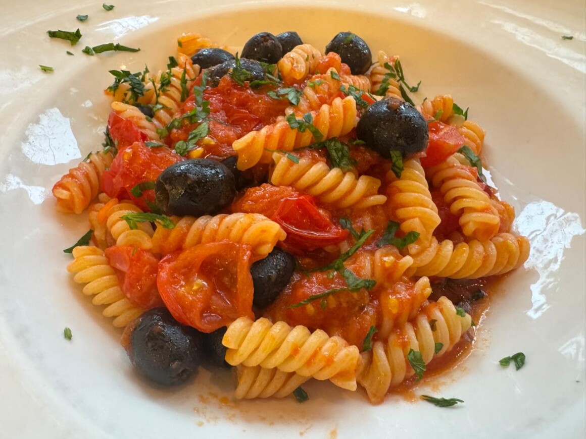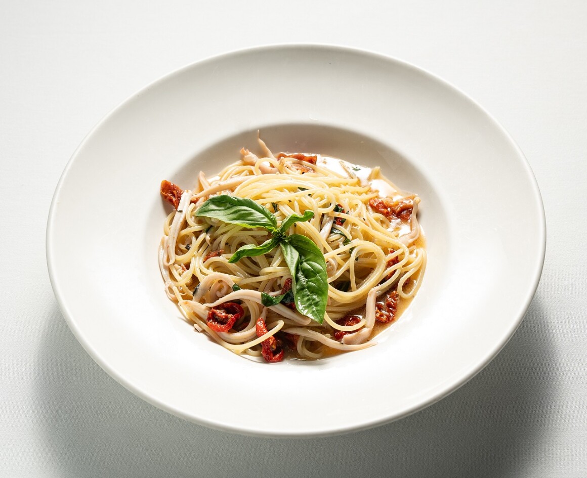 - Паста с кальмарами, вином, чесноком, помидорами черри, перцем чили и базиликом