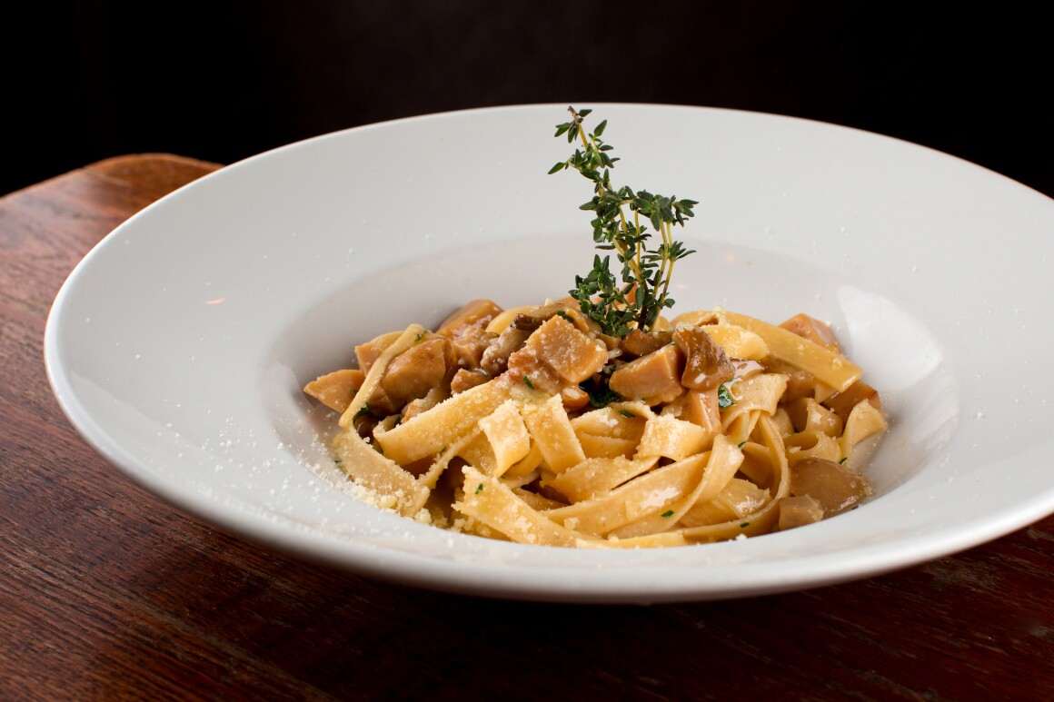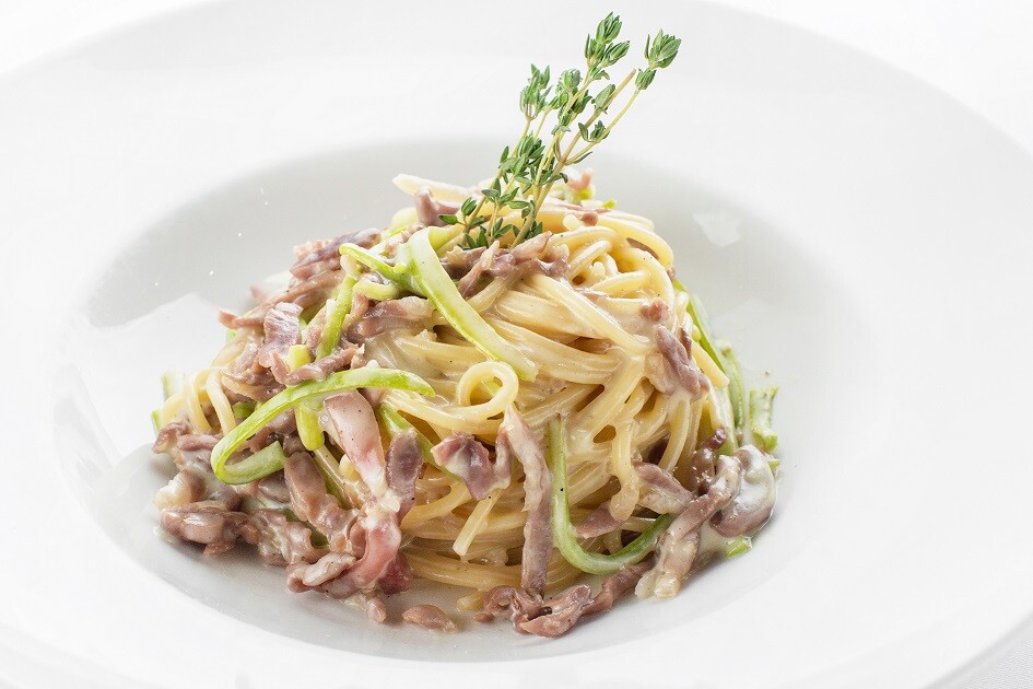 - Домашняя паста со сливочным маслом, луком шалот, вином, сливками, обжаренной пармской ветчиной и дробленными фисташками
