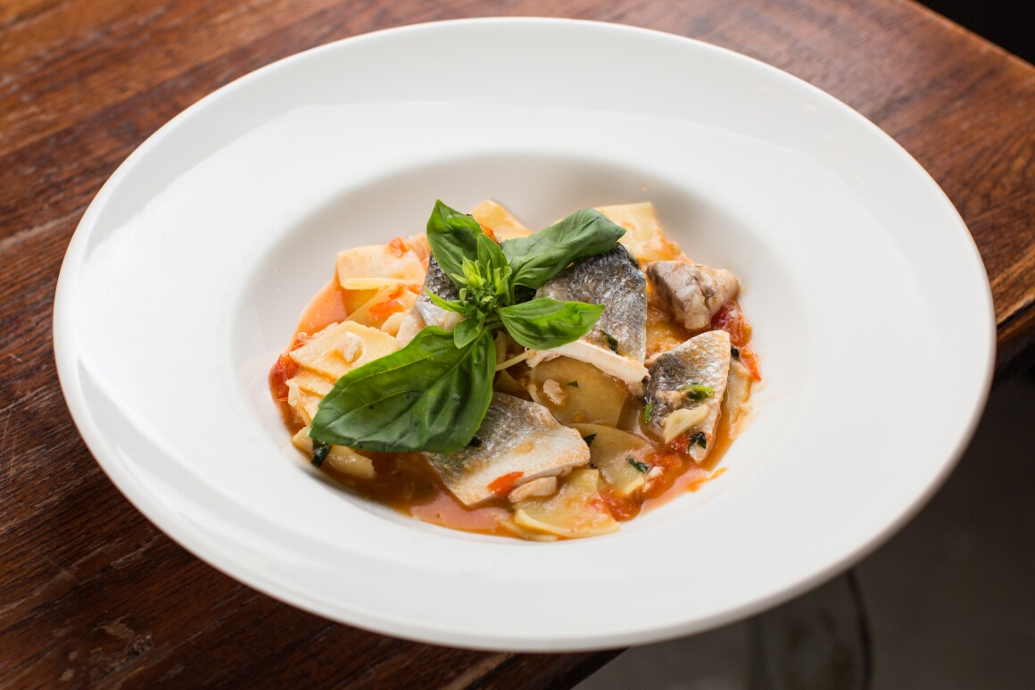 - Филе окуня томленное с сельдереем, чесноком, луком шалот, рыбным бульоном, помидорами черри и перцем чили