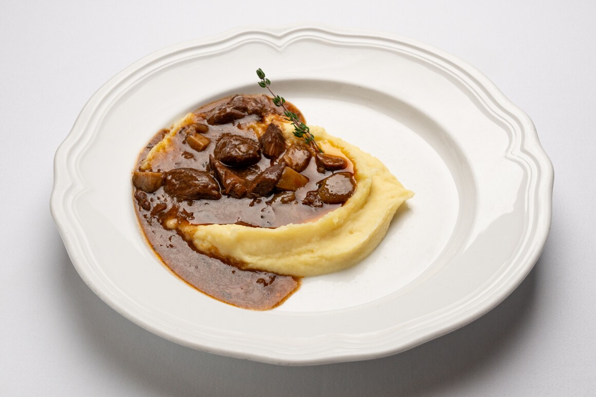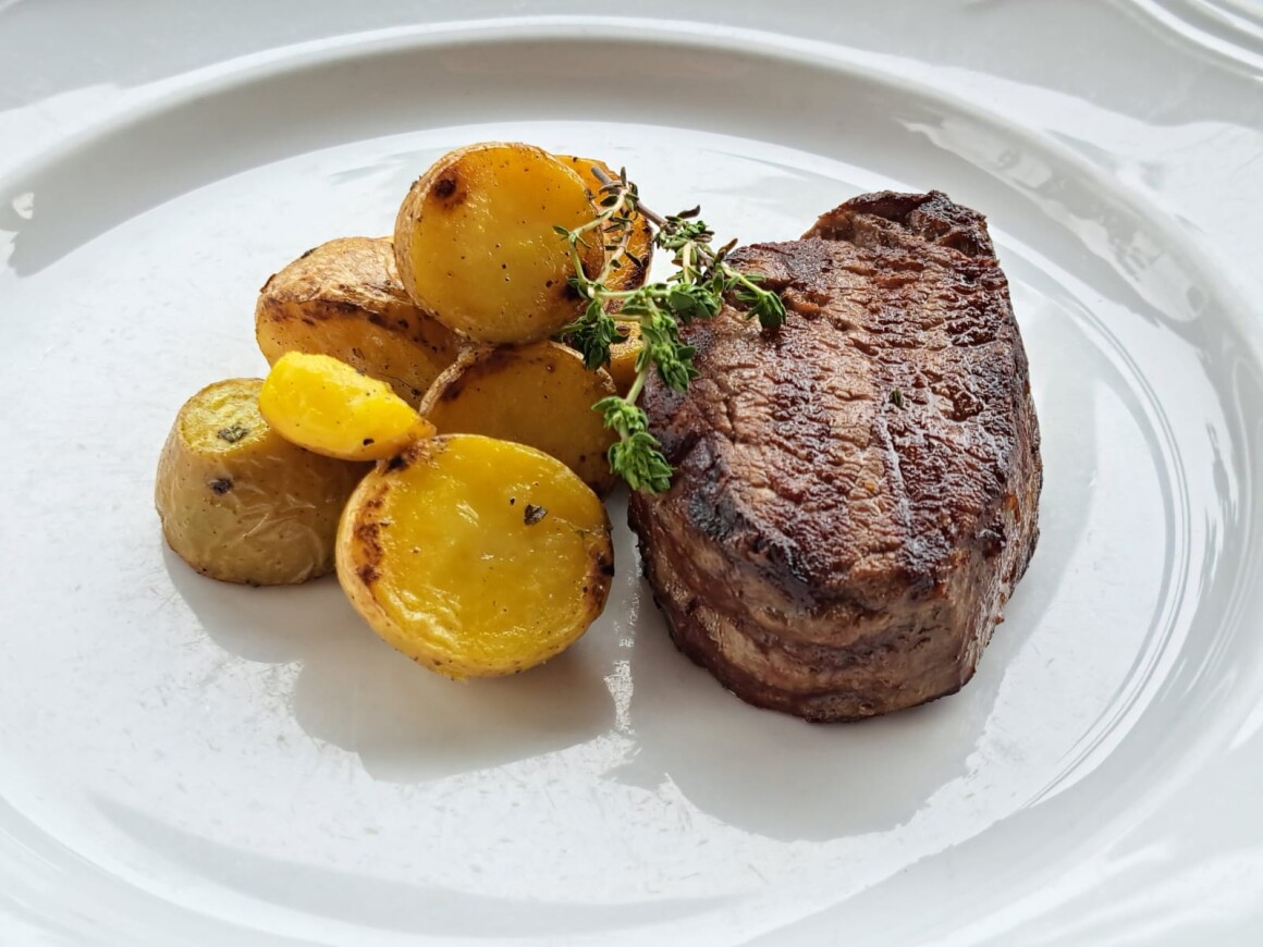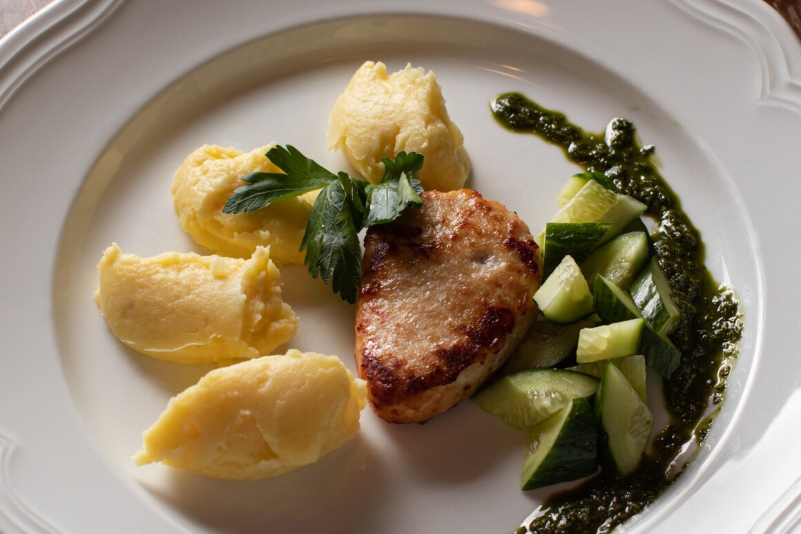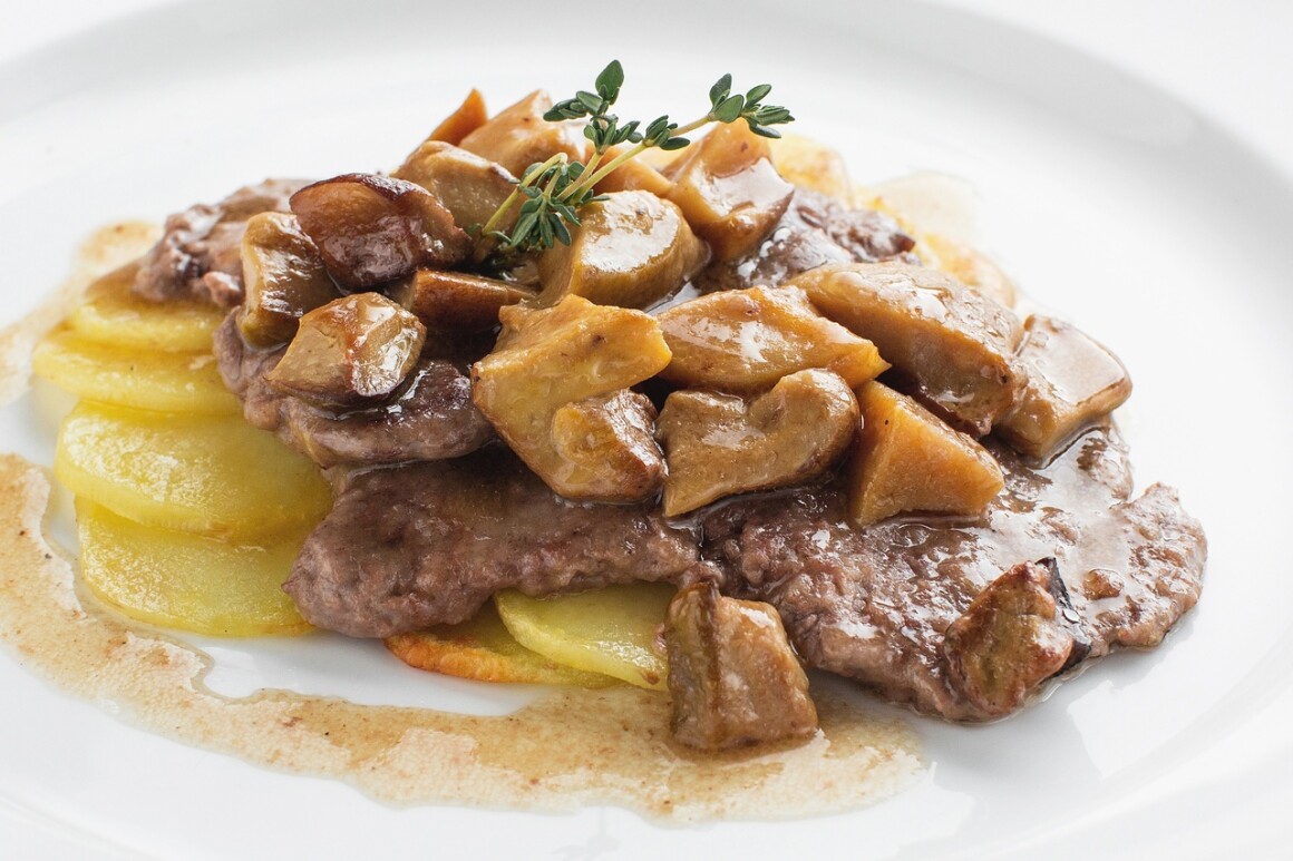 - Обжаренная свиная шейка с яблоками и соусом с белыми грибами, соусом демиглас, сливками и вином. Подается с запеченным картофелем черри