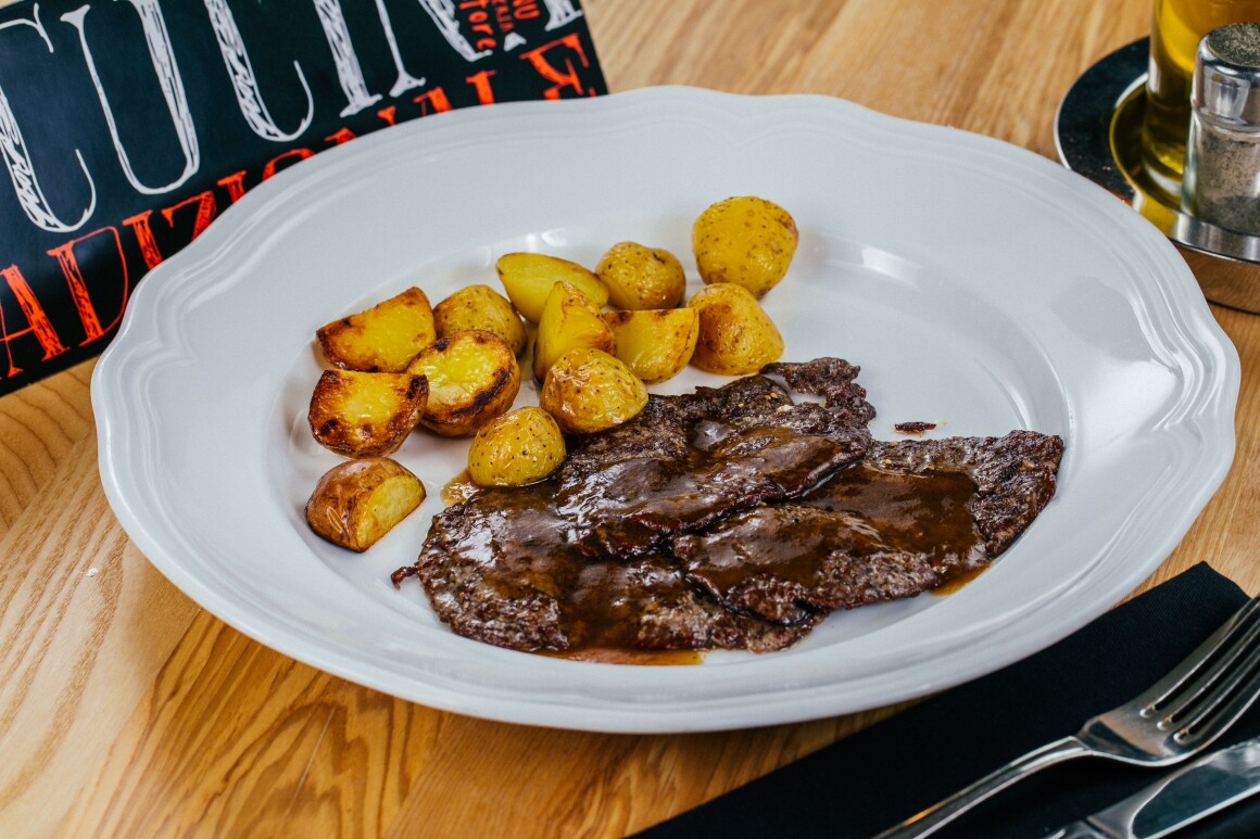 - Отварной и обжаренный телячий язык со сметанно-йогуртовым соусом и запеченным картофелем черри