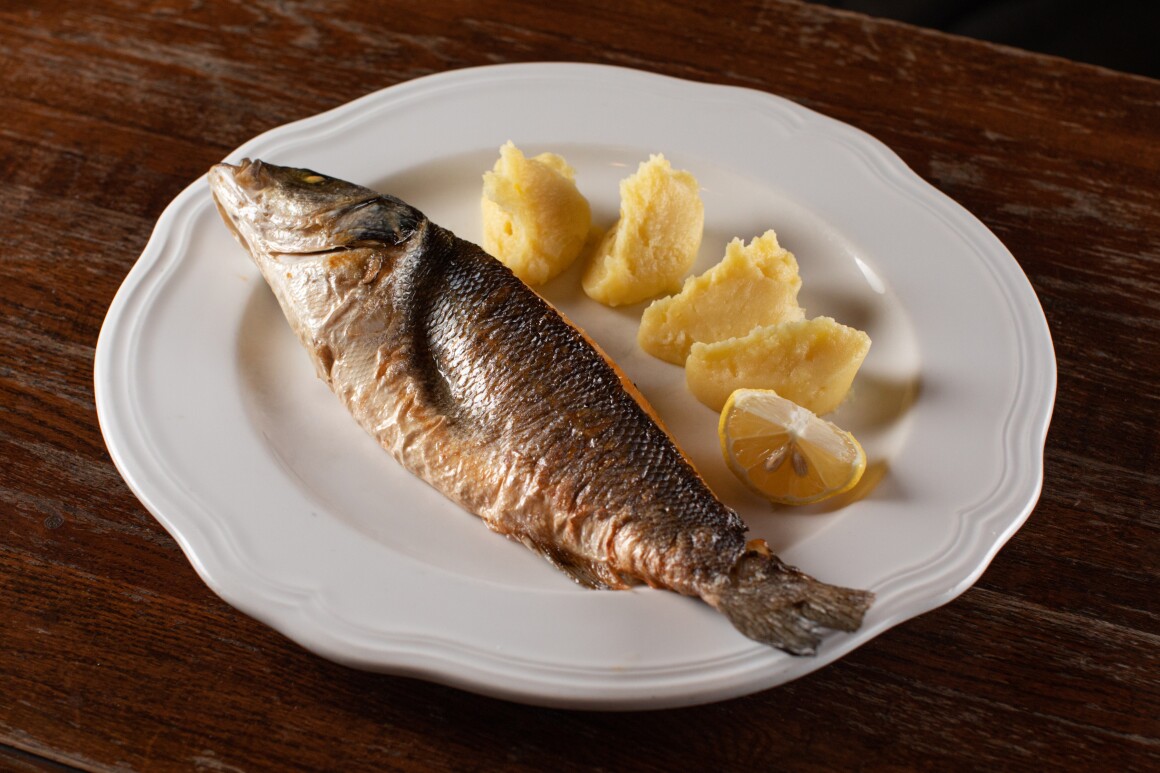 - Филе дорадо запеченное с кабачками, вином и травами под слайсами картофеля с помидорами черри и крошкой из маслин