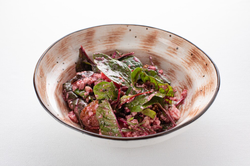 Микс листьев с соевым сыром тофу, помидорами, перловкой, киноа, грецкими орехами с горчично-свекольным соусом