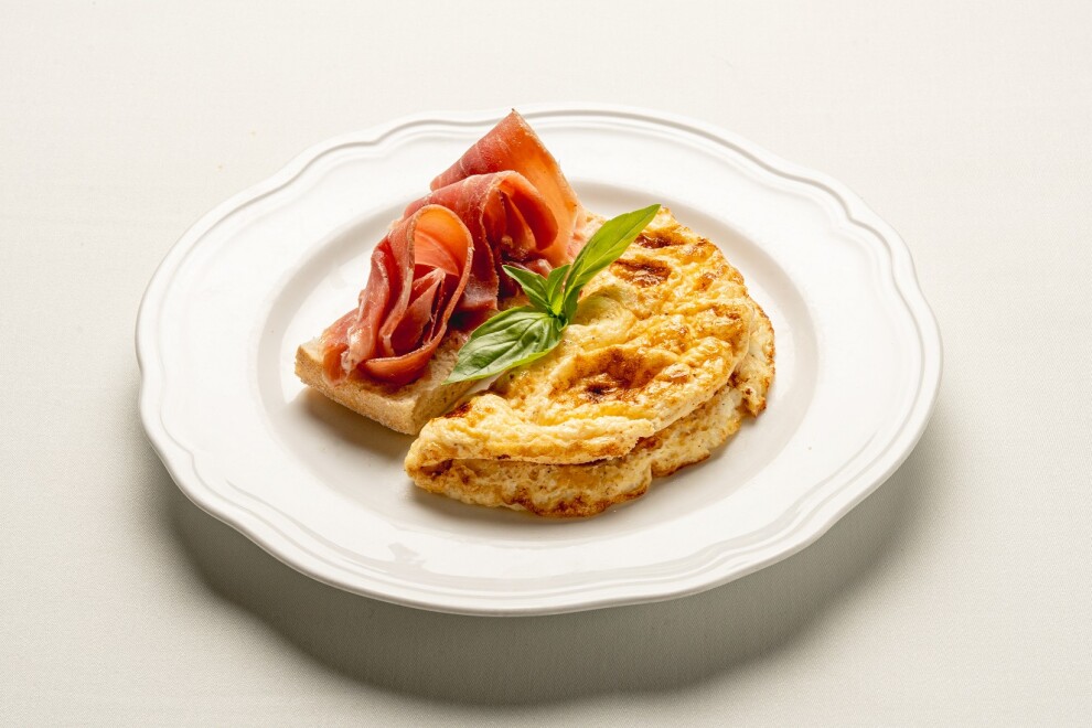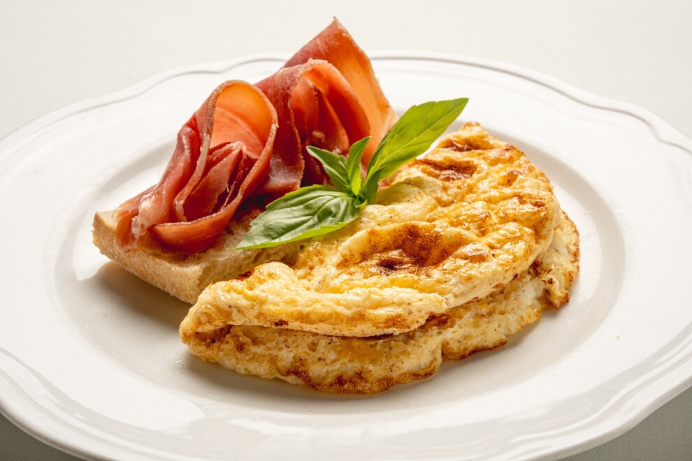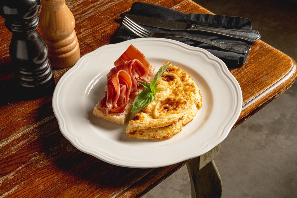 Омлет из двух куриных яиц, молока и сыра пармезана, со слайсами пармской ветчины и чиабаттой
