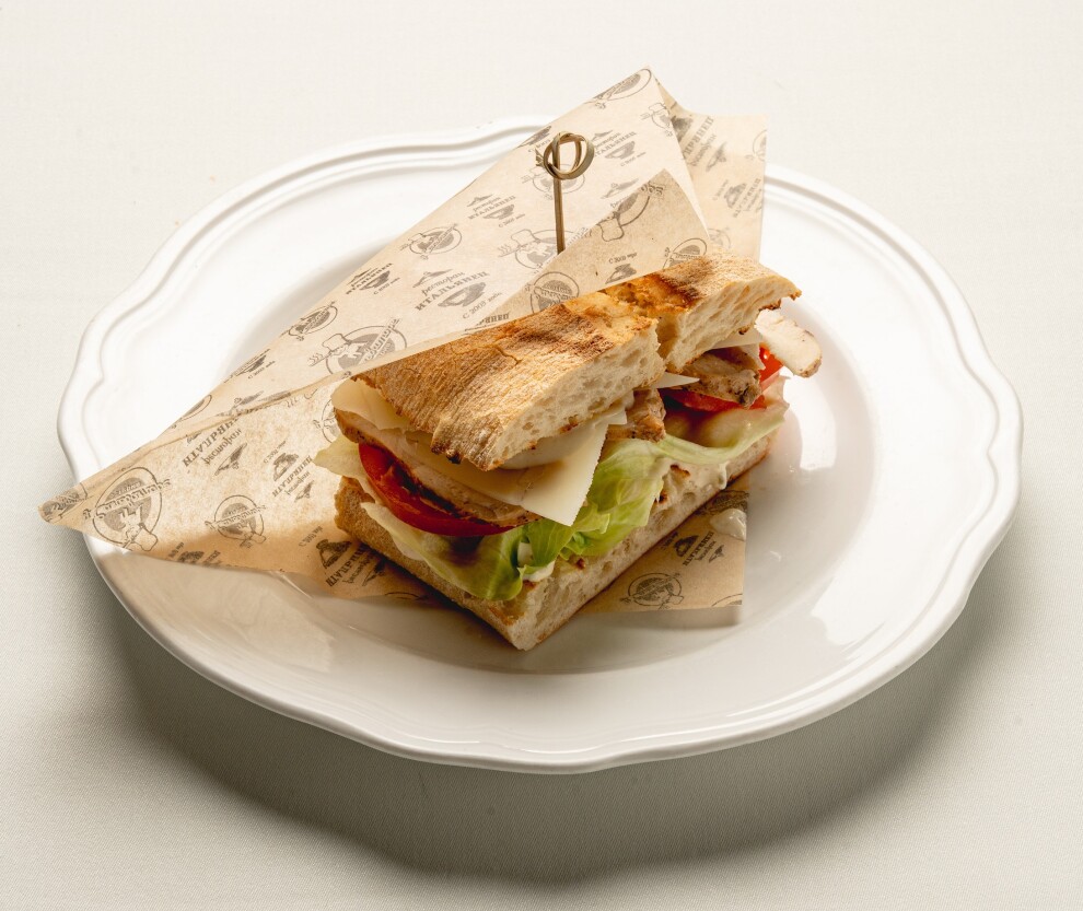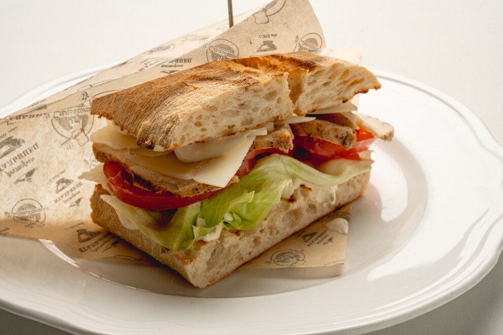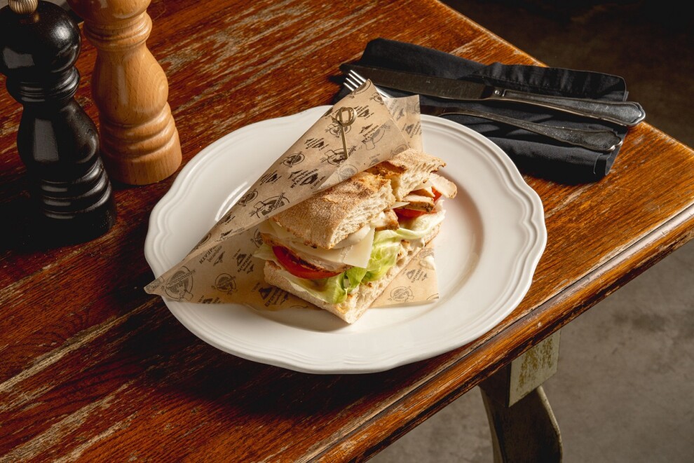 Обжаренная чиабатта с обжаренным куриным филе, анчоусами, пармезаном, листьями айсберга, чесноком, соусом цезарь из домашнего майонеза с каперсами, соусом ворчестер и соком лимона