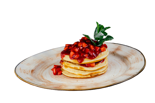 Оладьи из муки, яйца и молока (сода пищевая, погашенная соком лимона), с ягодным соусом, клубникой и сахарной пудрой