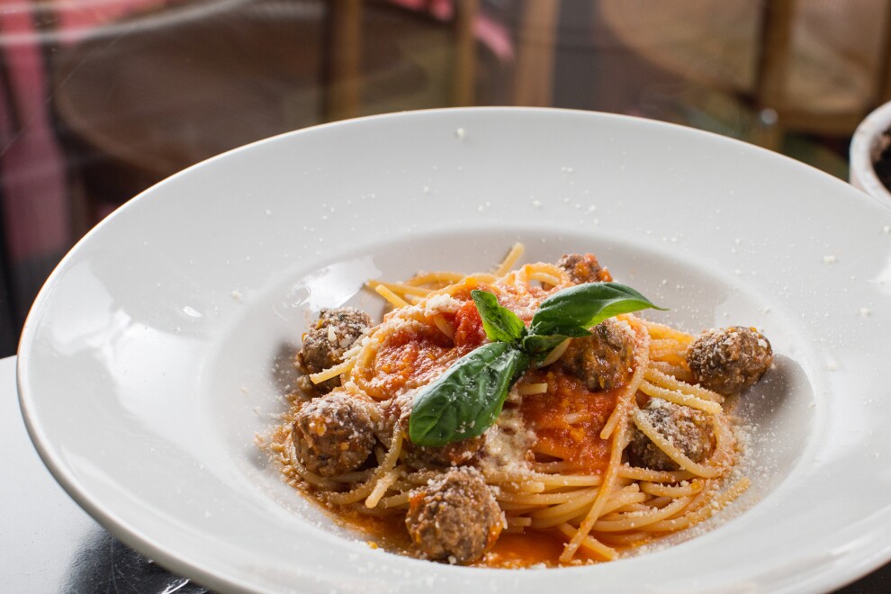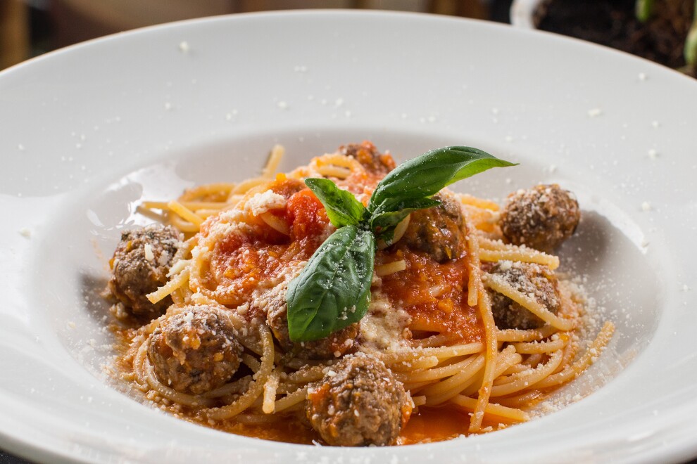 Спагетти с фрикадельками из говядины, томатным соусом, пармезаном