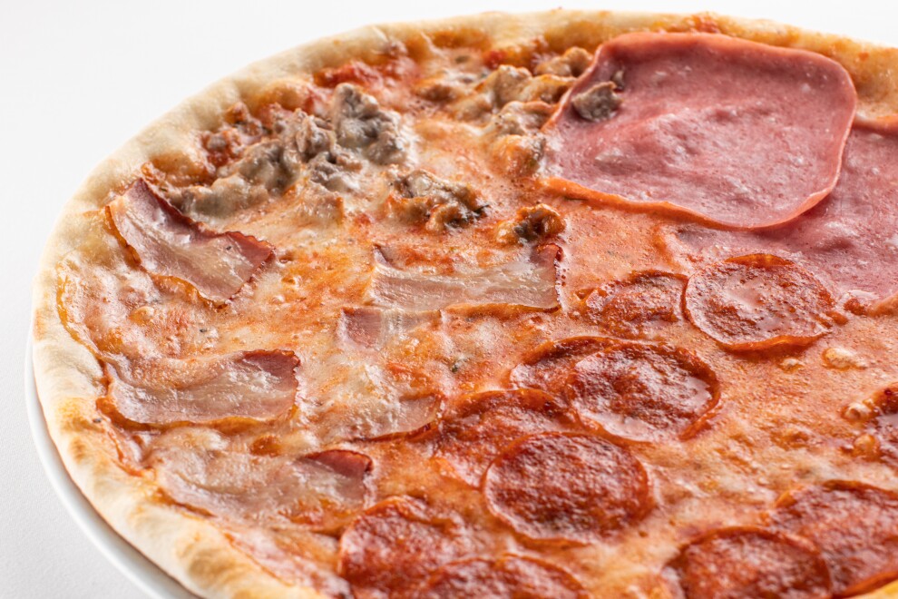 Пицца на тонком тесте: основа из пшеничной муки твердых сортов, томатный соус, моцарелла для пиццы, ветчина, пепперони, бекон, сальчичче