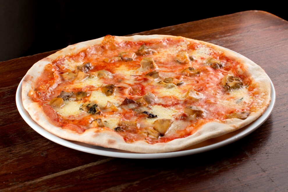 Пицца на тонком тесте: основа из пшеничной муки твердых сортов, томатный соус, моцарелла для пиццы, сыр маскарпоне, белые грибы