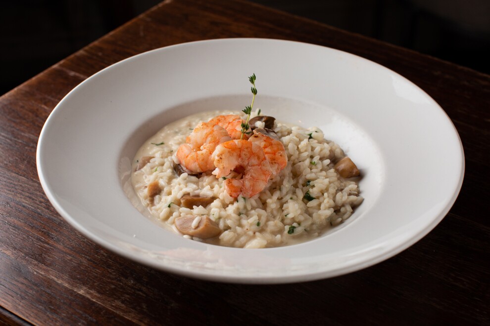 Ризотто с луком шалот, белым вином, сливочным маслом, белыми грибами, креветками,пармезаном, петрушкой и тимьяном