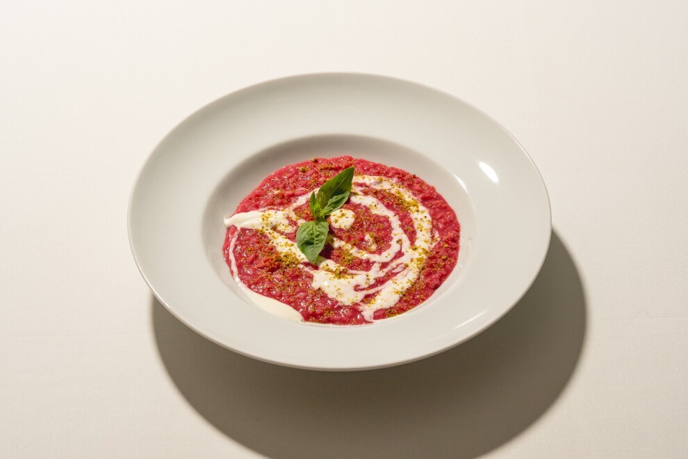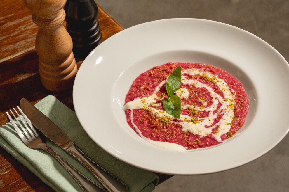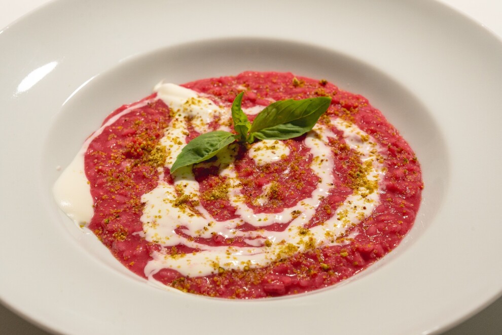 Ризотто с вином, сливочным маслом, кремом из свеклы и сыром пармезан. Подается с сыром крем чиз и дробленными фисташками