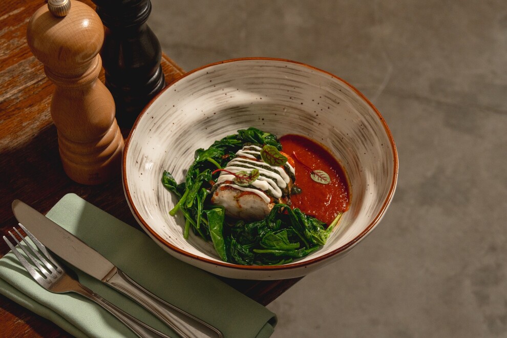 РУЛЕТ ИЗ ФИЛЕ СИБАСА С ПРИПУЩЕННЫМИ ЛИСТЬЯМИ ШПИНАТА И ТОМАТНЫМ СОУСОМ