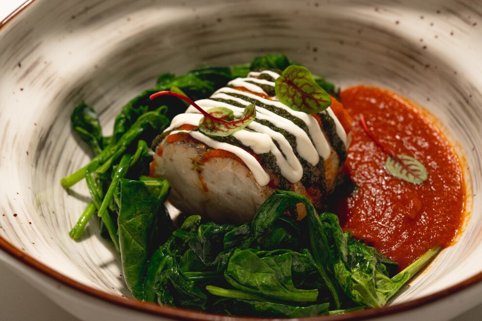 Рулет из филе сибаса с начинкой из мяса сибаса с добавлением маскарпоне, сливок, яйца и специй, приготовленный в сувиде. Подается с припущенными листьями шпината и с соусами из перетертых помидоров с оливковым маслом и песто