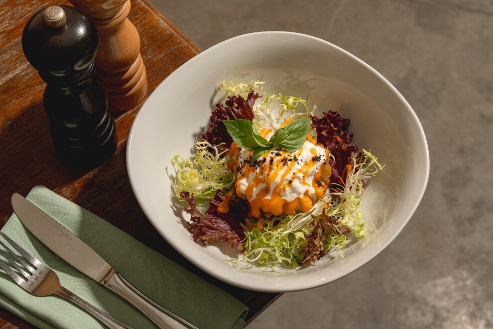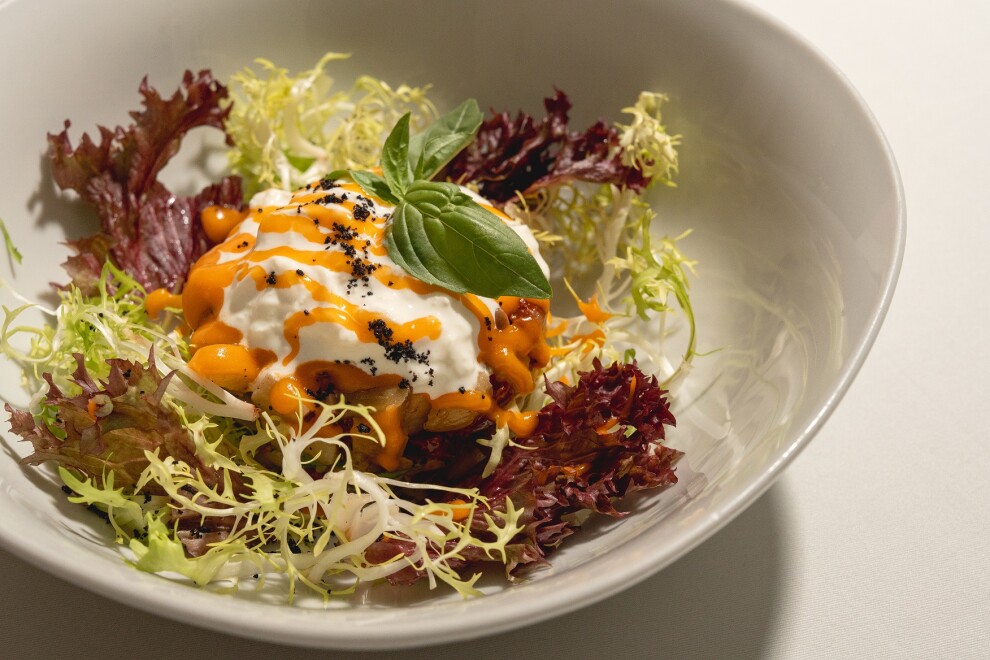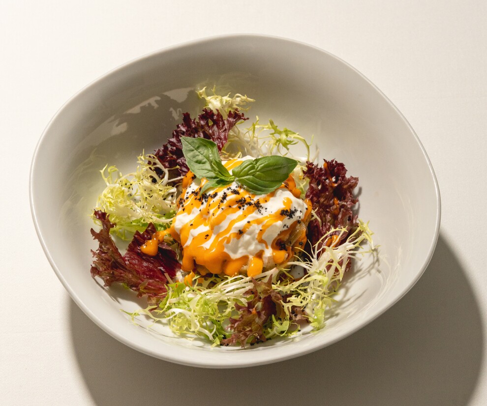 Обжаренные баклажаны на листьях салатов с вялеными помидорами, страчателлой, оливками таджаске, крошкой из маслин и домашним томатным майонезом