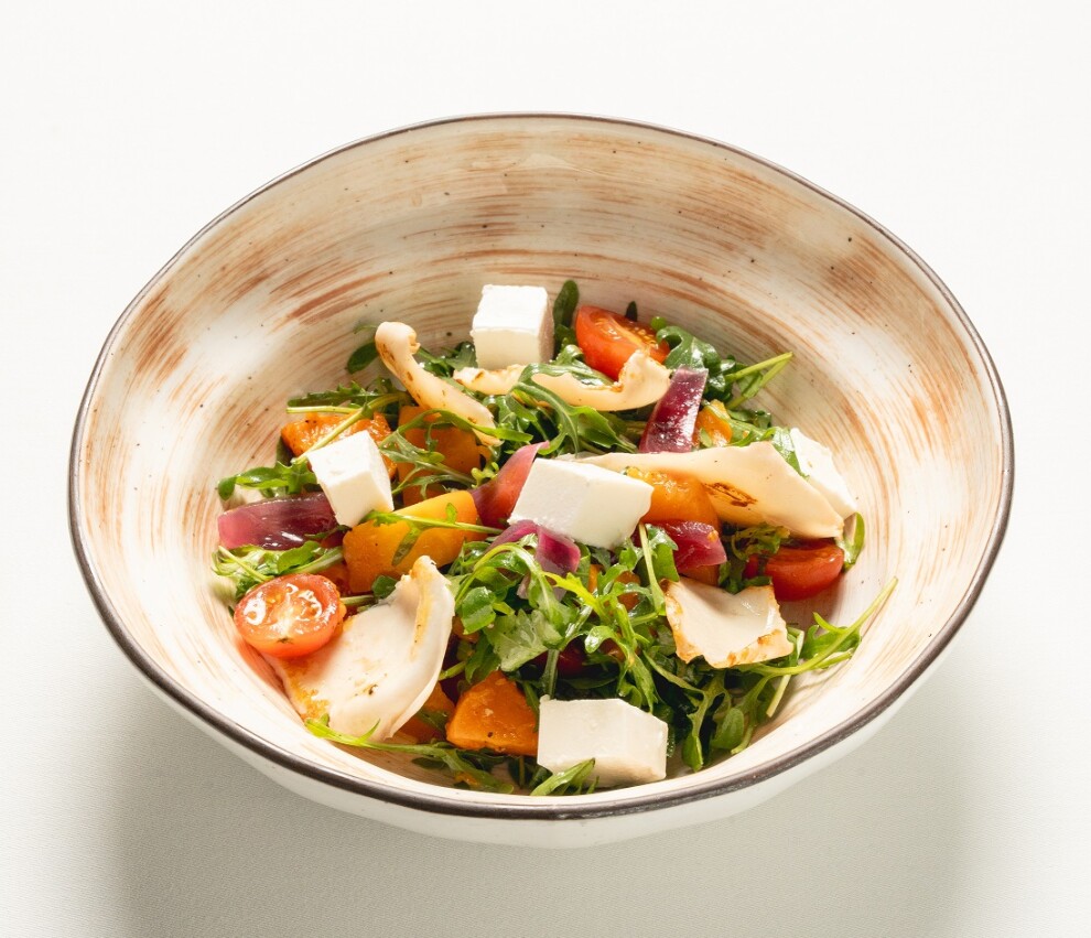 Листья рукколы с обжаренными кальмарами, красным маринованным луком, помидорами черри, сыром фета и апельсиново-горчичным соусом с добавлением меда и оливкового масла