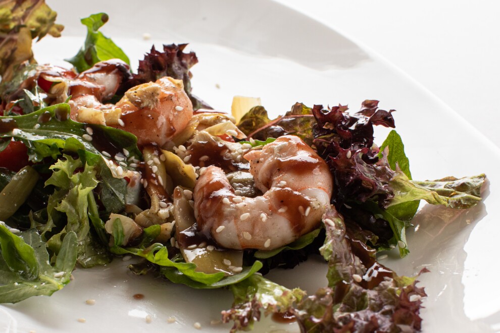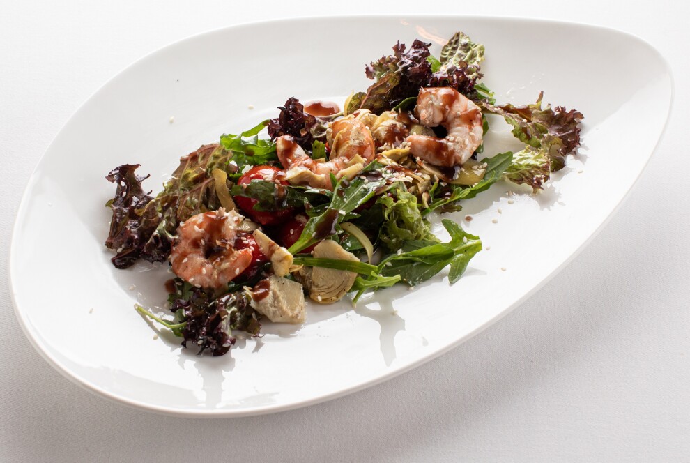 Руккола, лолло россо, базилик, помидоры черри, артишок маринованный, обжаренные креветки, соус сезам и цитронет
