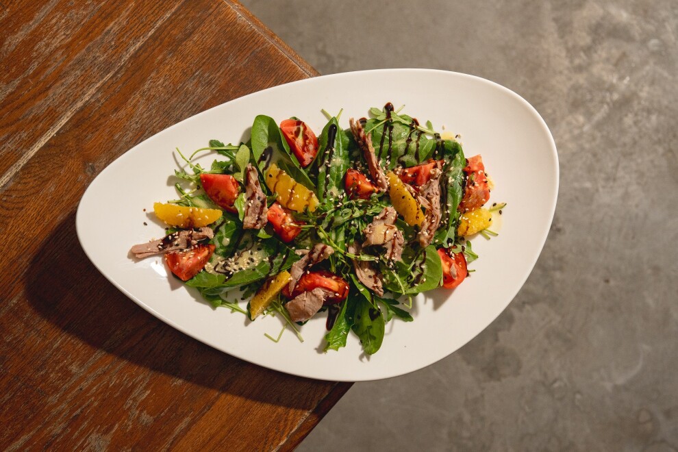 Салат из листьев шпината и рукколы с запеченным мясом утки, кусочками апельсинов и помидора, семенами черного кунжута, бальзамиком и апельсиново-горчичным соусом с добавлением меда