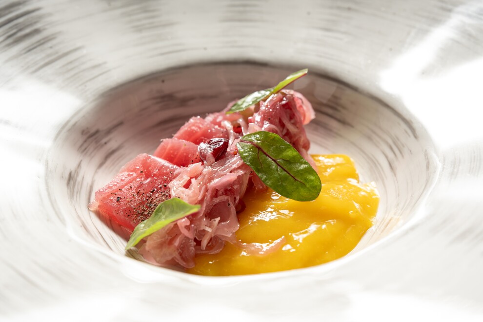 Ломтики тунца, маринованная с клюквой капуста, соус из манго с имбирем и перцем чили, кинза