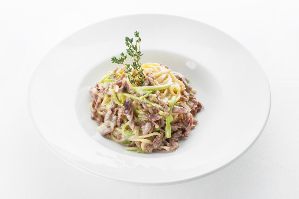 Спагетти с вином, сливками, беконом, кабачками, яйцом, базиликом и пармезаном