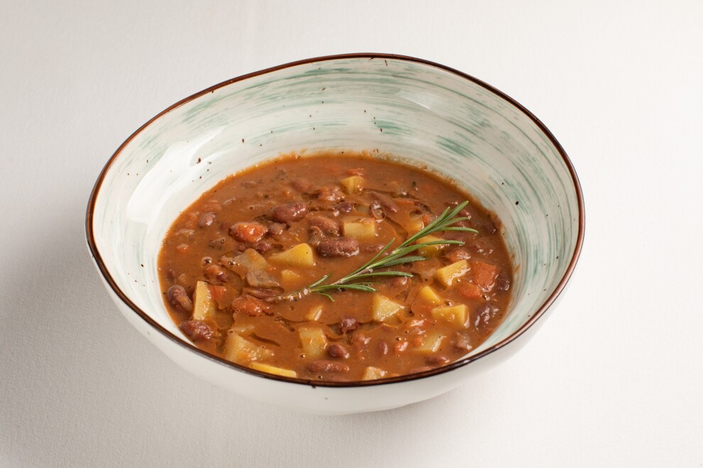 Густой суп из красной фасоли с картофелем, томатами, морковью, сельдереем, луком, чесноком и розмарином