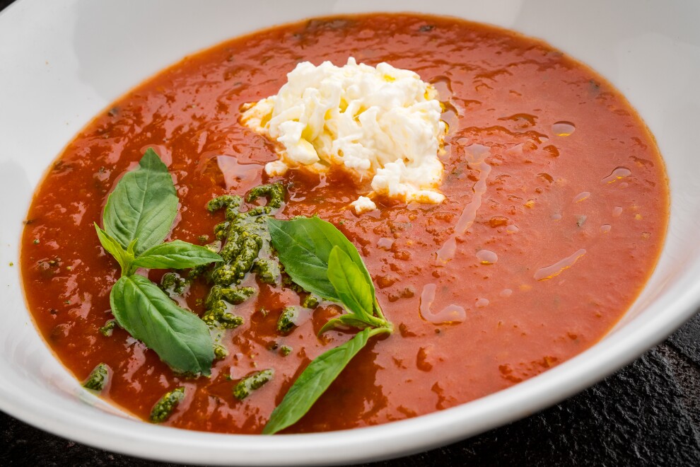 Томатный суп с базиликом, подается с моцареллой и соусом песто