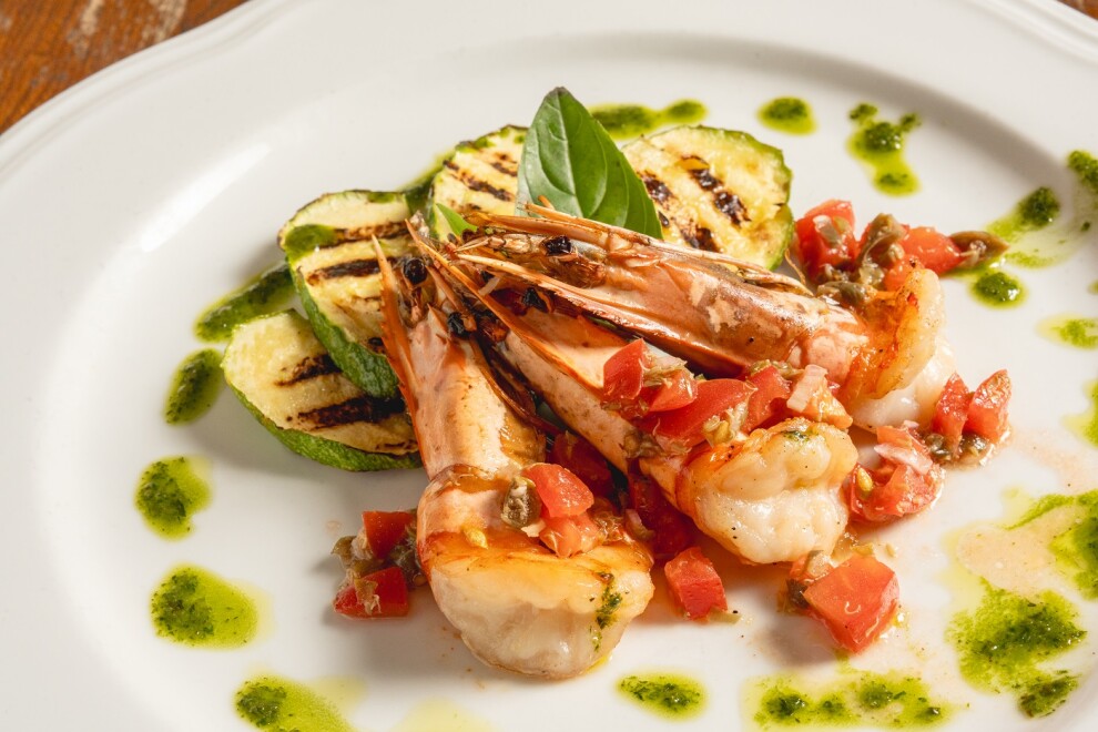 Тигровые креветки на гриле, с кабачками на гриле и соусом сальса из помидоров, каперсов, лука шалот и оливкового масла