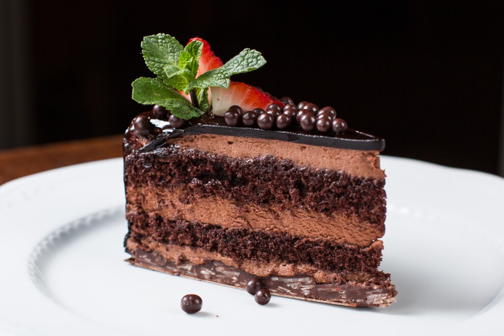 Многослойный торт на хрустящей миндальной основе с горьким шоколадом, из шоколадного бисквита, крема баварезе с нутеллой, молочного заварного крема и крема из темного шоколада
