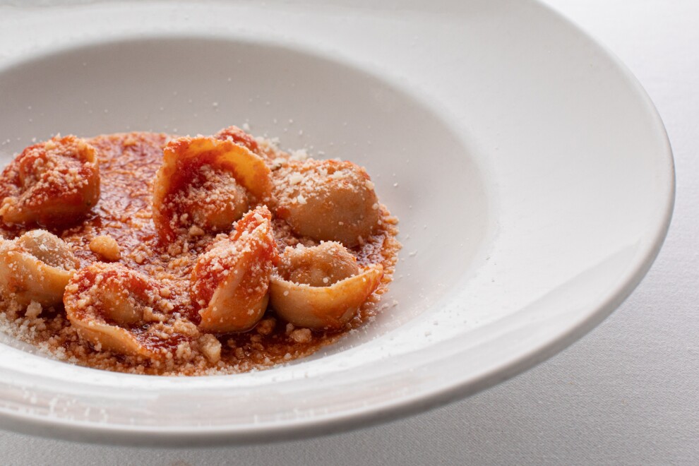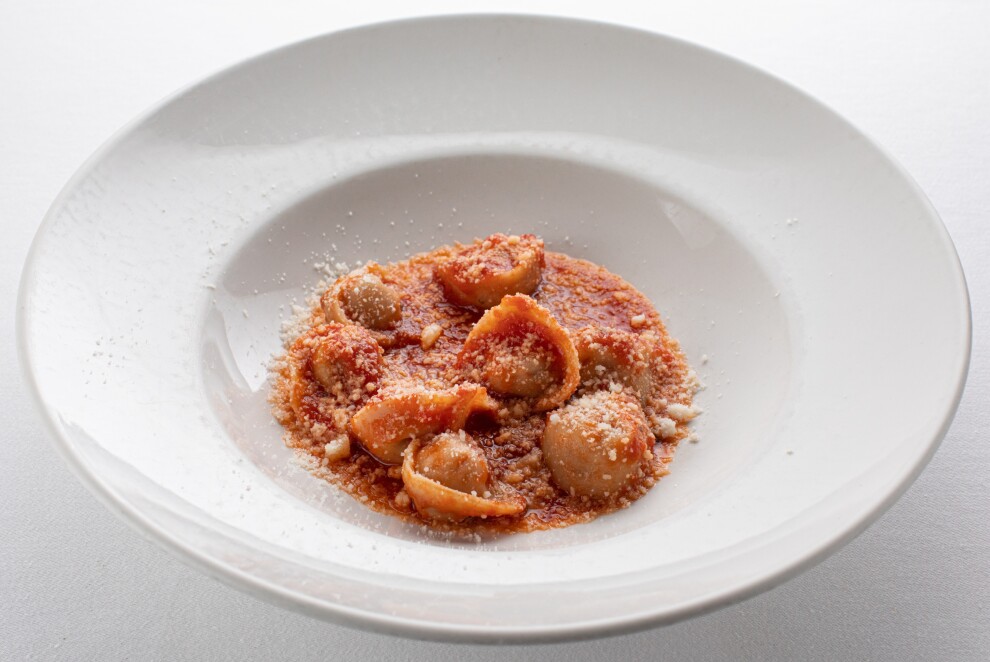 Паста, фаршированная: телятина, свинина, пармская ветчина, лук репчатый, рикотта, вино белое, с соусом из сливок и томатов, базилик