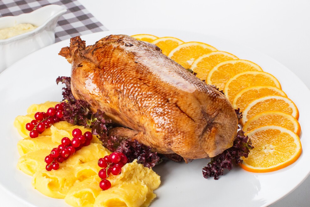 Утка, запеченная с яблоками, с картофельным пюре и яблочным соусом. На 4-6 персон